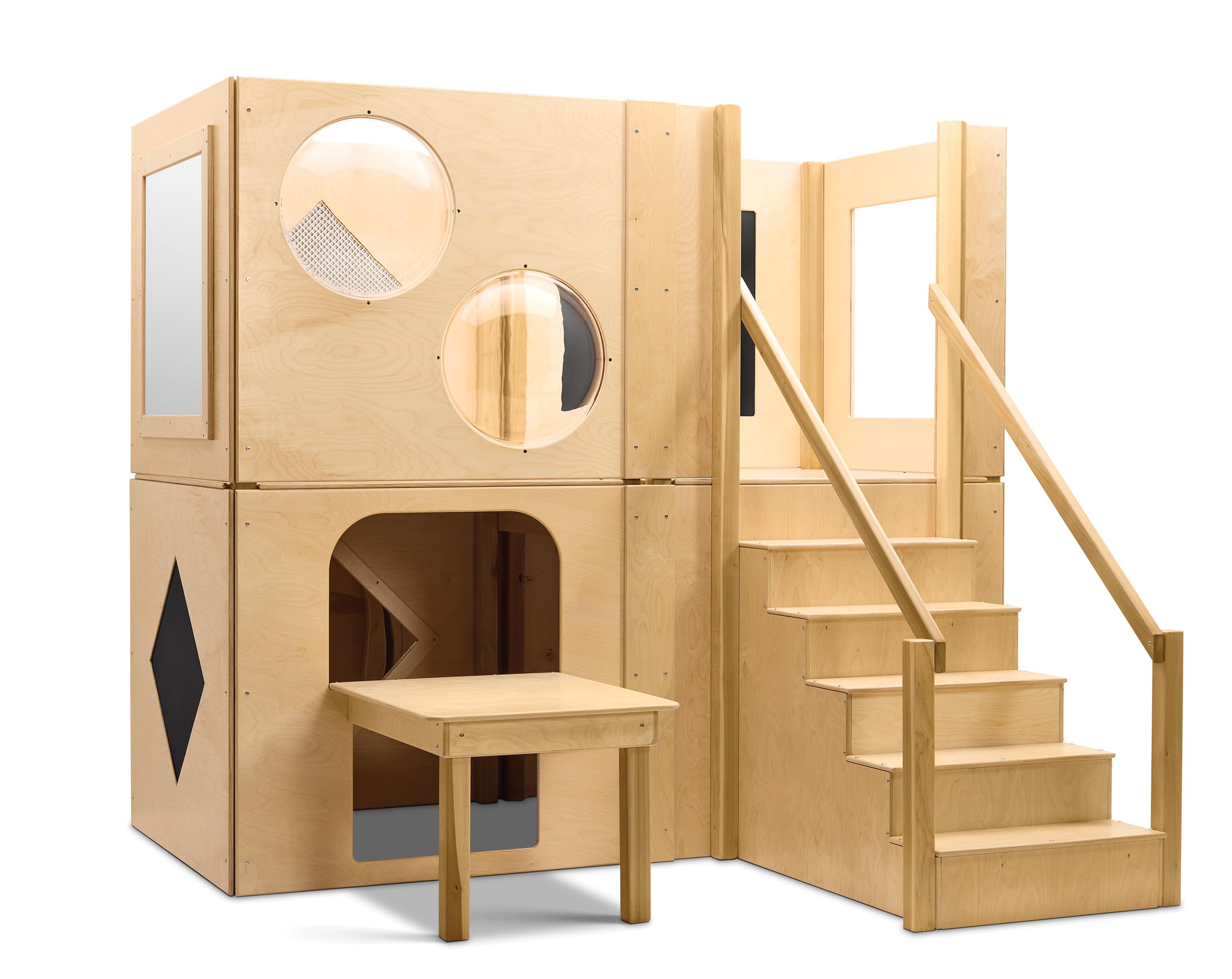 Enhance the experience with specialized panels and attachments. The Staircase adds safe, supported access to upper levels while promoting balance and confidence. The Puzzle Panel builds visual-motor skills and problem-solving through handson, creative play. The Mirror Panel encourages self-awareness, imitation and sensory feedback with a safe, shatter-resistant design. To build, combine two bases, a connector, a door, stairs and nine panels. The result is a dynamic, customizable environment that grows with your therapy needs.