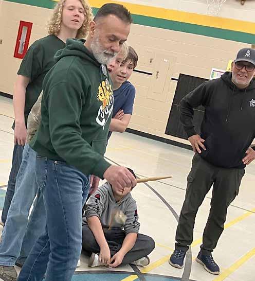 Centennial Central Public School recently held a unique cultural learning opportunity for students in Mrs. LeBlanc’s Grade 4 class, Mr. Dunlop’s Grade 6/7 class and Mr. Santia’s Grade 7/8 class. On Wednesday, March 11, students participated in an engaging program that incorporated Haudenosaunee history, culture and traditional games through interactive 45 minute sessions held in the school gym. The event was led by Dallas Squire, who is Kahnyen’kehàka (Mohawk), Turtle Clan from the Six Nations of the Grand River. Dallas, a former professional lacrosse player, has spent more than a decade sharing traditional games and Haudenosaunee culture with students across Ontario. The program blended hands on learning with cultural storytelling, offering students a meaningful opportunity to deepen their understanding of Indigenous traditions and histories. Above, Dallas Squire watches as Mr. Santia attempts to place the ring on the pin in front of his grade 7 and 8 students.