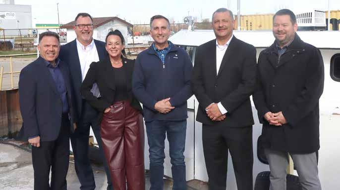 Gathered after the $10 million announcement at the Wheatley Harbour are Essex MPP Anthony Leardi, Chatham-Kent Mayor Darrin Canniff, Chatham-Kent Councillor Lauren Anderson, Chatham-Kent Essex MPP and Ontario Minister of Agriculture, Food and Agribusiness Trevor Jones, Executive Director, Ontario Commercial Fisheries’ Association Vito Figliomeni and Ontario Minister of Natural Resources Mike Harris. SUN photos by Mark Ribble