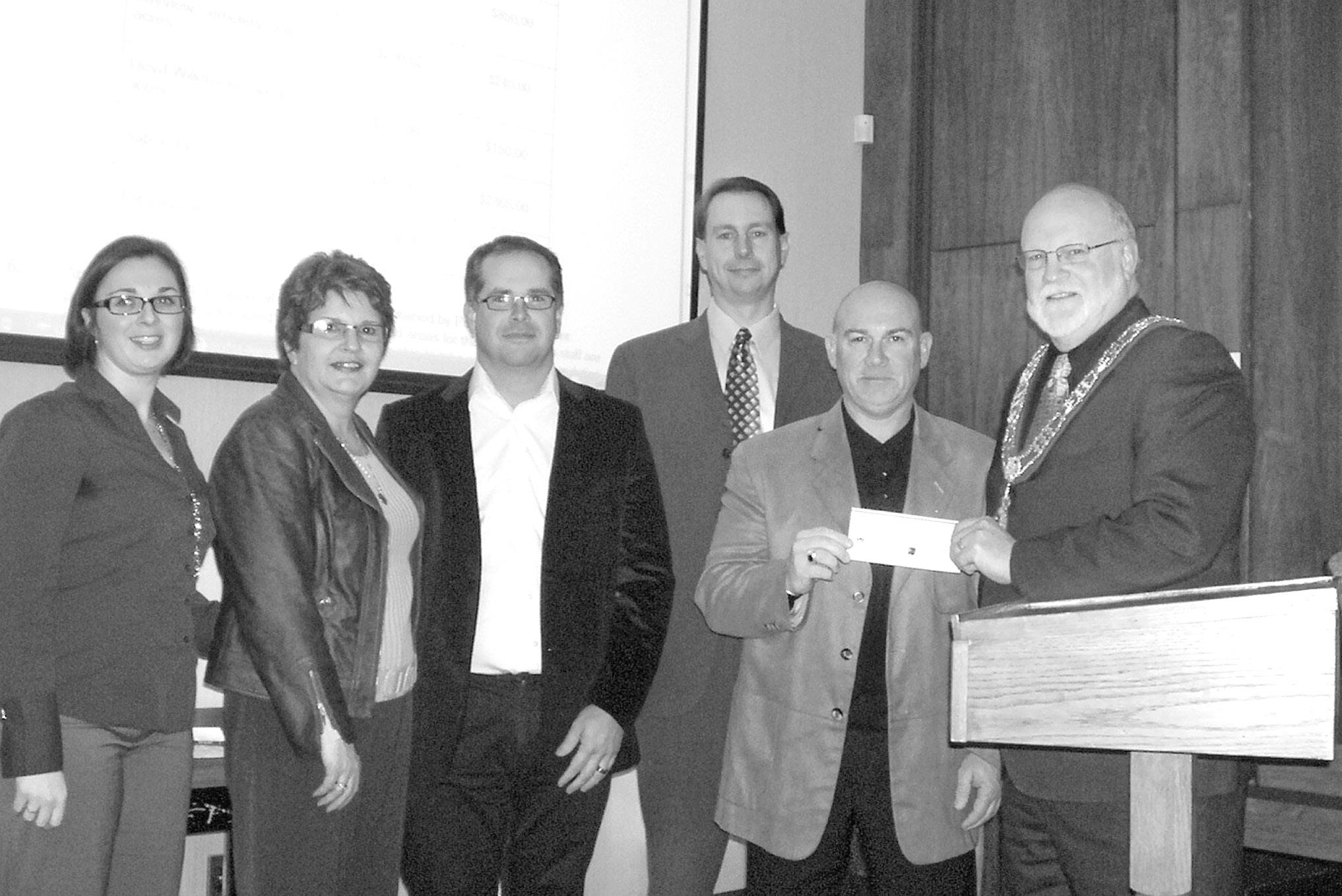 At Monday’s council meeting, representatives of the Kinsmen Club of Leamington presented Mayor John Paterson with a cheque for just under $5000, representing the final installment of their quarter million dollar fundraising commitment to the Kinsmen Arena. Pictured above from left to right are Amanda Smith, manager of the Complex, Brenda Fischer, recreation communications and public relations spokesperson, Steve Ingratta, president of the Leamington Kinsmen, Tyler Hicks, pastpresident and arena fundraising chairman, Harry Garbarino, fundraising chairman, and Mayor John Paterson accepting the cheque.