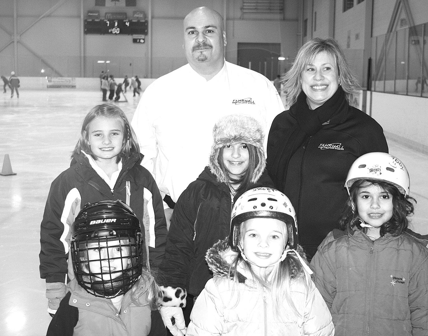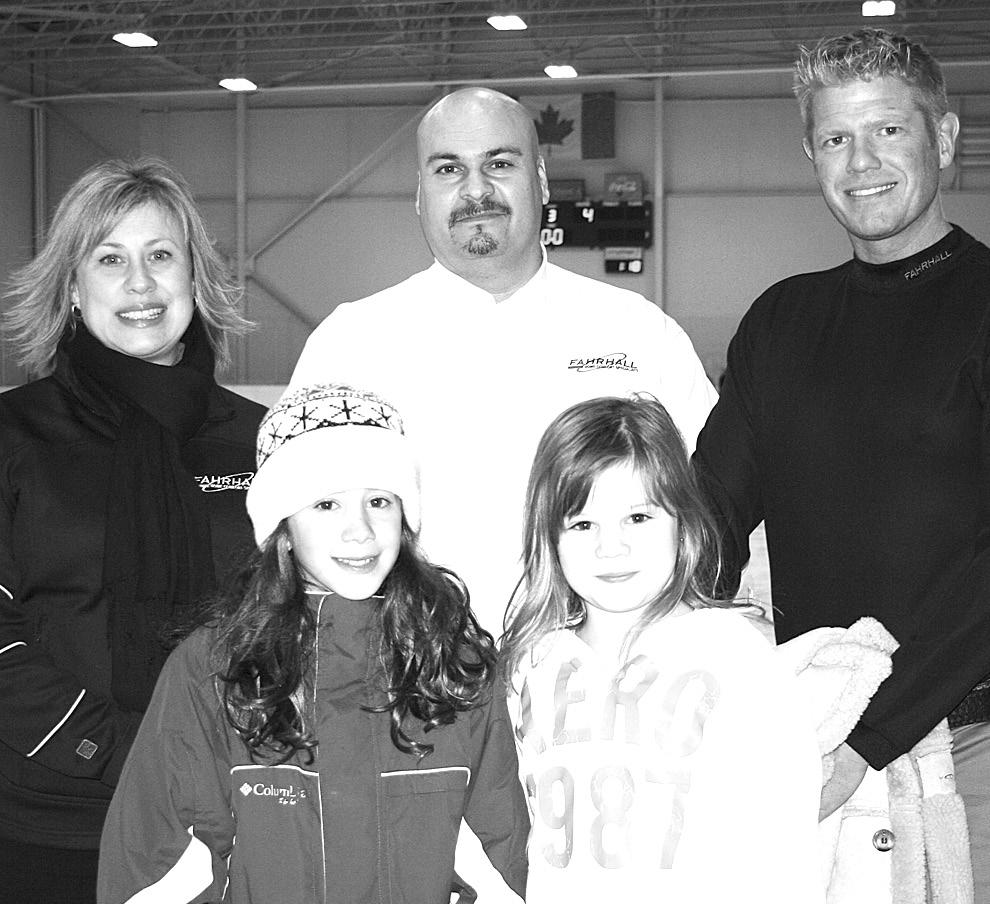 ABOVE RIGHT: Ciara Claro and Faith Lewis of Kingsville are pictured with representatives of Fahrhall Home Comfort Specialists who sponsored the free skate on Friday, January 14 at the Unico rink at Leamington Kinsmen Recreation Complex. In back, from left to right, are Marina Mouat, Marketing Coordinator, Tony Coppola, Home Comfort Specialist and Doug Brink, Health and Safety Trainer.