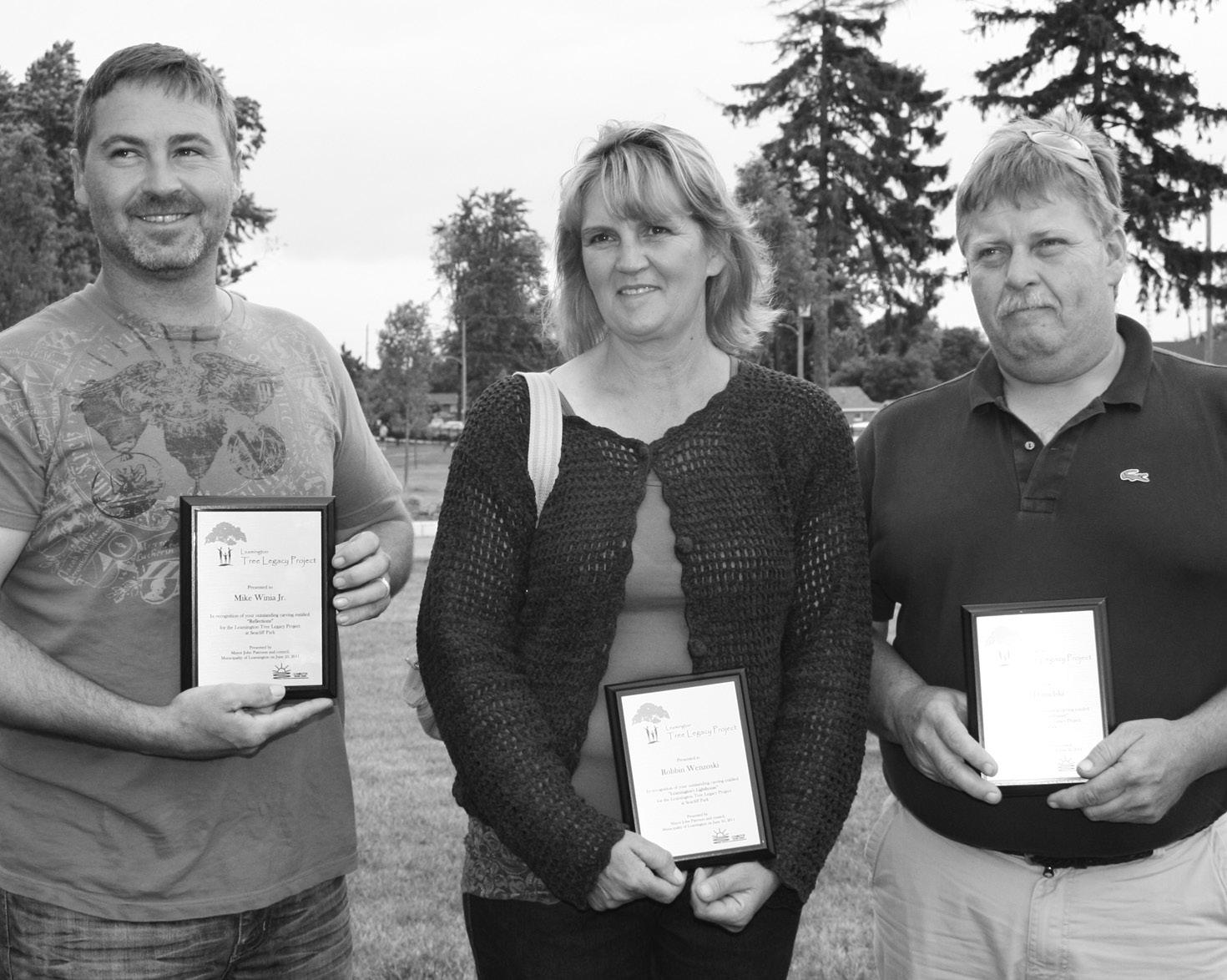 The three artists whose ideas were chosen to create Leamington’s Tree Legacy Project were on hand during the celebration and re-opening of Seacliff Park on Saturday, June 25. The artists came up with the ideas for their art pieces. From left are Mike Winia, “Relections”, Laura Wenzoski (Robbin Wenzoski absent), “Lighthouse”, and Paul Danielski, “Backbone of the Community”. The three artists were given a commemorative plaque for their work presented by Mayor John Paterson and Amanda Smith, Director of Recreation and Tourism.