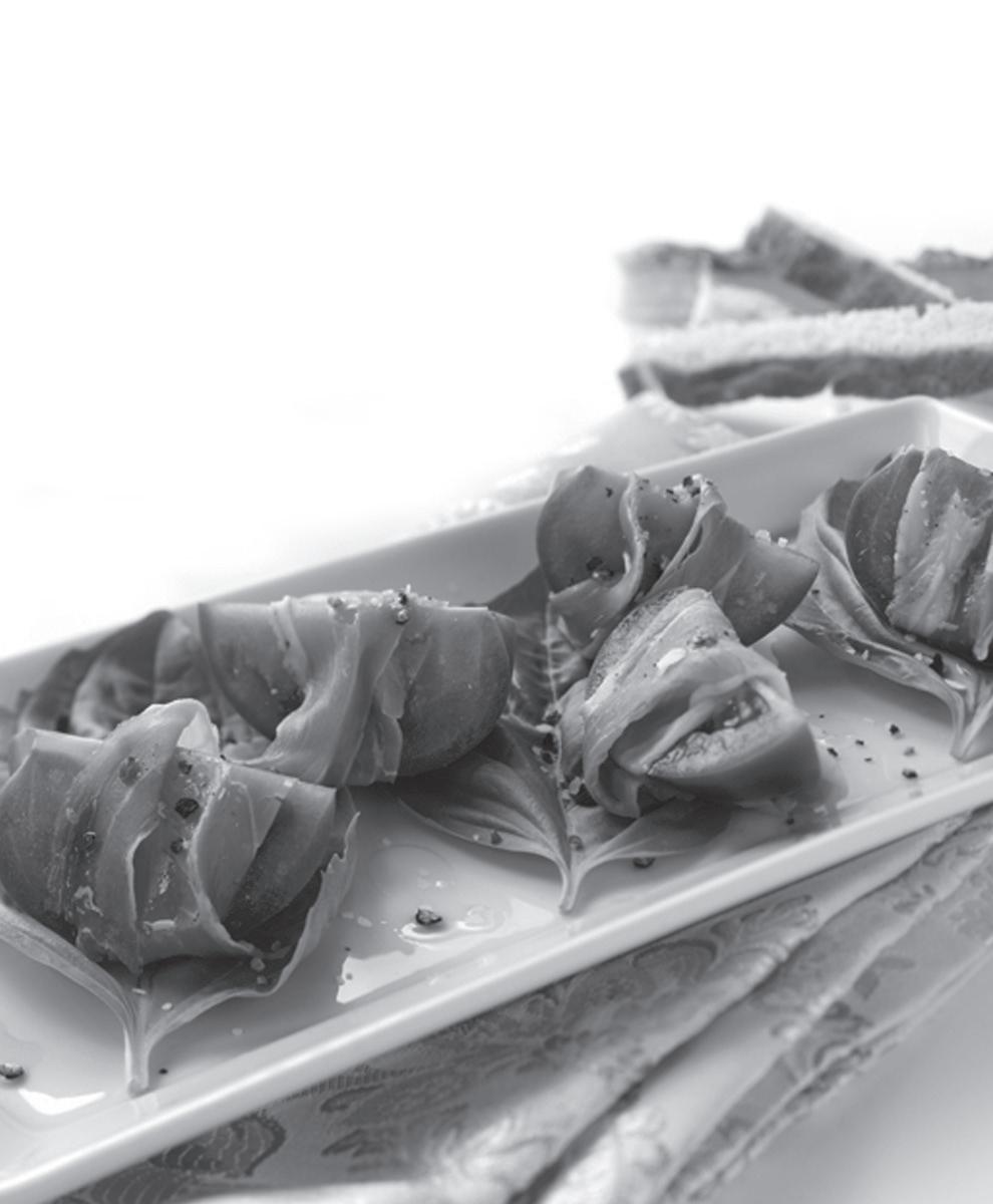 4 SUNSET® Kumato™ Tomatoes, quartered vertically, 4 thin slices of prosciutto, quartered, extravirgin olive oil, coarse sea salt and coarse-cracked black pepper, minced or grated lemon zest (optional).
