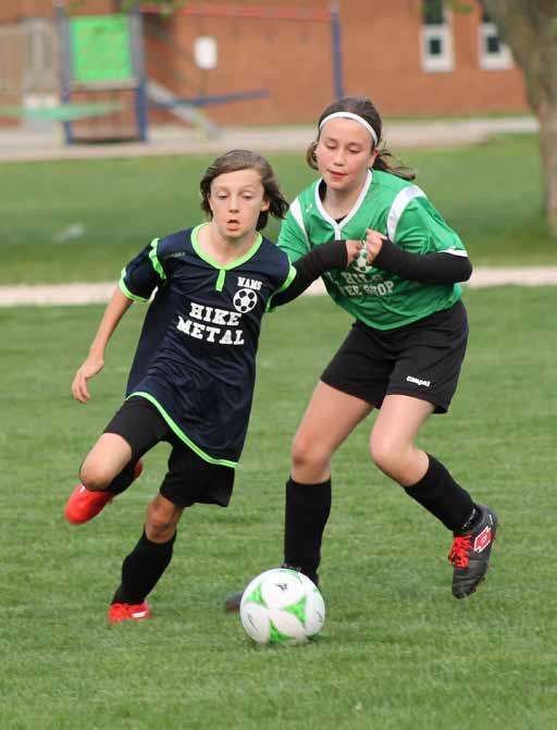 With soccer in full swing on the local pitches, many kids are out enjoying the fresh air and green grass. Here, Kepler Robinson of Hike Metal and Aubrie Hatt of Lil Hil’s Coffee Shop battle it out on the pitch May 17 in the U11 Division for Wheatley Minor Soccer. Submitted photo
