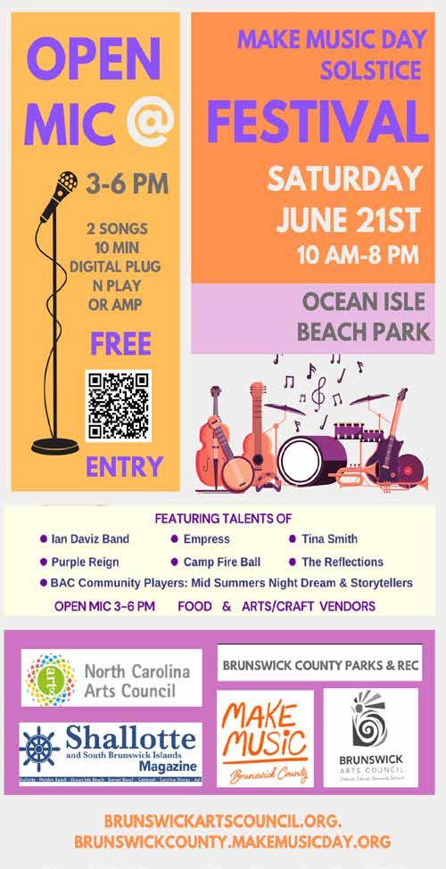 Shop for arts, crafts, and more at Shallotte’s Market, 9 am to 1 pm at Mulberry Park, 123 Mulberry Street. Dates are June 7 and 21.