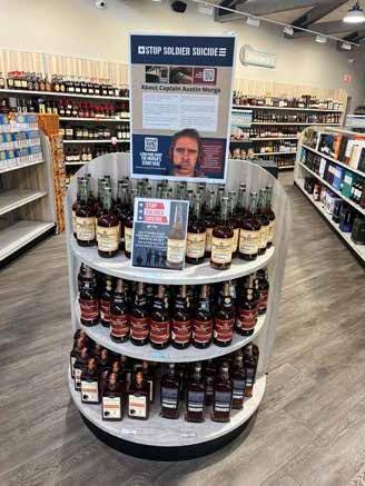 The Southport ABC Store, a government-controlled retail outlet, cannot donate to specific causes. It can, however, help by raising awareness of the Soldier Suicide Stop organization. The promotional bottle, Southern Star Bourbon, features the Stop Soldier Suicide logo and website address, along with a tribute to Captain Austin Murga. Customers can go to the website to learn more about the organization and to make a donation. The store display includes a poster with a picture of Captain Murga, along with a QR code that links to his story and a QR code for donations to Stop Soldier Suicide.