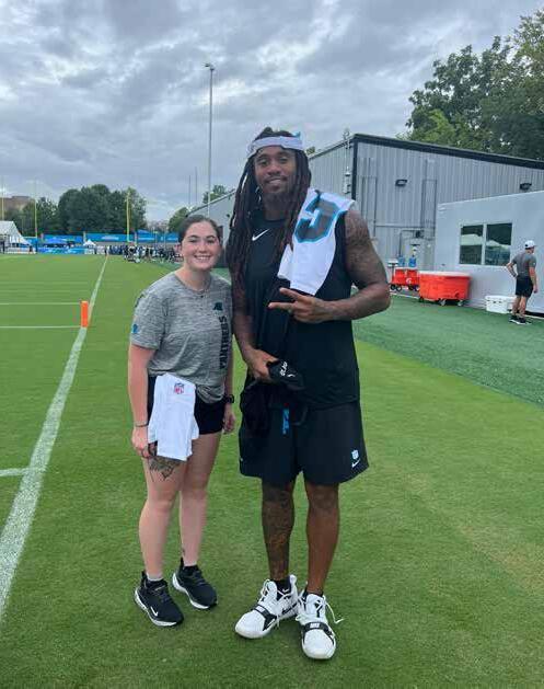 “I’m not a water girl. I have footballs on me. When we do a drill, and they snap the ball to the quarterback, I’m the one who catches the ball like the quarterback and they’ll ask for my feedback like which way did the ball go,” she said. She said she worked a lot with Austin Corbett, a guard for the Panthers. She also said that everyone eats lunch together at training camp, so she got to see most people at some point. She said she loved talking to linebacker Shaq Thompson, and that quarterback Bryce Young is kind of quiet, very focused on the game, and a great motivator. She even had the chance to throw some reps with him one day.