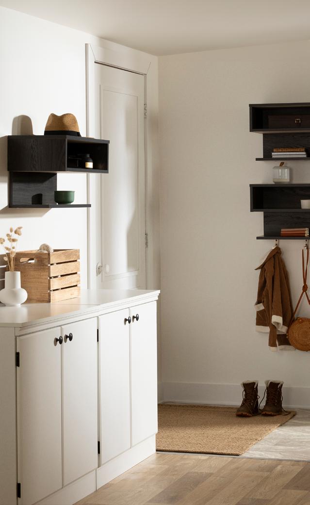Create specific storage zones: Set up specific storage areas by designating dedicated spaces for different categories of items, such as coats, shoes, backpacks, and more. Use hooks, shelves, baskets, or boxes to maintain organization and functionality throughout.