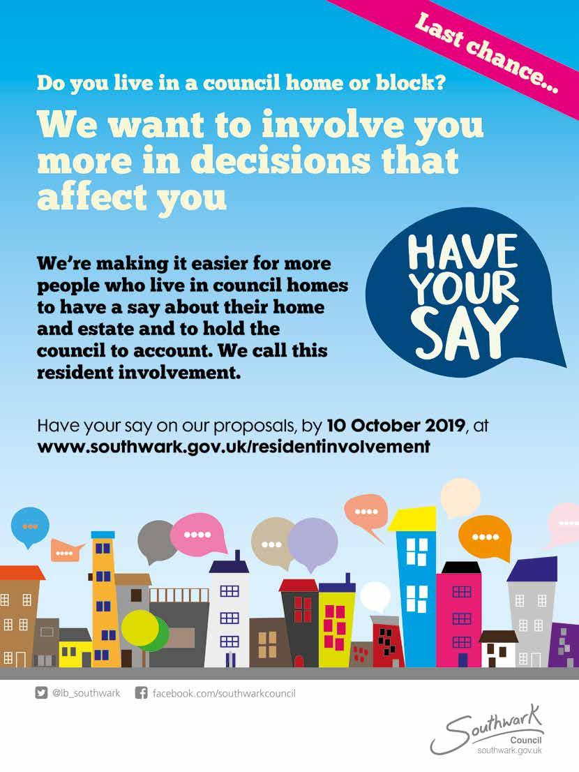 We are proposing some significant changes, so we can give more support for Tenant and Resident Associations to put on local activities, discuss housing issues at Ward Forums and get more residents involved in making their estates great places to live, and in the decisions that most matter to them. The deadline is Thursday 10 October. You can have your say at www.southwark.gov.uk/residentinvolvement