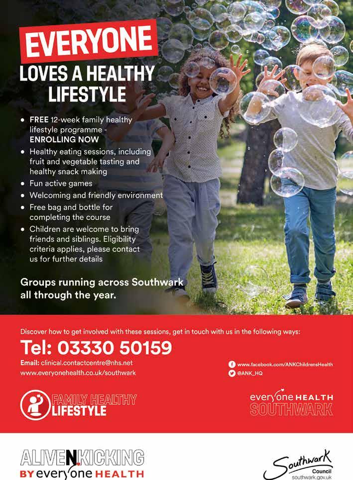 Alive ‘n’ Kicking is a successful lifestyle programme that helps children and young people aged anywhere between five and 19 years of age reach and maintain a healthier weight. The service comprises three age-specific programmes for infants and juniors (age 5-11), seniors (age 12-15) and young people (age 16+), each of which delivers age-appropriate activities, messages and behaviour change strategies that will help benefit the whole family. The sessions focus on portion sizes, healthy eating habits and how to shop on a budget. For more information visit www. everyonehealth.co.uk/southwark-council/child-weight-managementalive-n-kicking/ or call 0333 005 0095 and speak to a member of the team or speak to your school nurse.