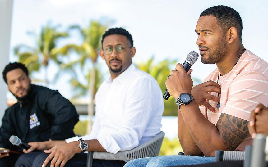 Above: Local students mingle with each other and visiting Edison Award winners. Below Left: 2022 Pro Athlete Pitch Panelists: Byron Jones, Miami Dolphins (right), answers an audience question while Brandon Rule (left) and Josh Childress, Retired Professional Basketball Player (center), look on. Below Right: The 2022 Young Edison Challenge sponsor and medalists at Community Day 2022. (l-r) Charlotte County Foundation Chief Executive Officer, Ashley Maher; Gold, Pria Sawhney, MA; Bronze, Maggie Zhang, Overland Park, KS; Silver, Sonia Patel, Naples, FL.