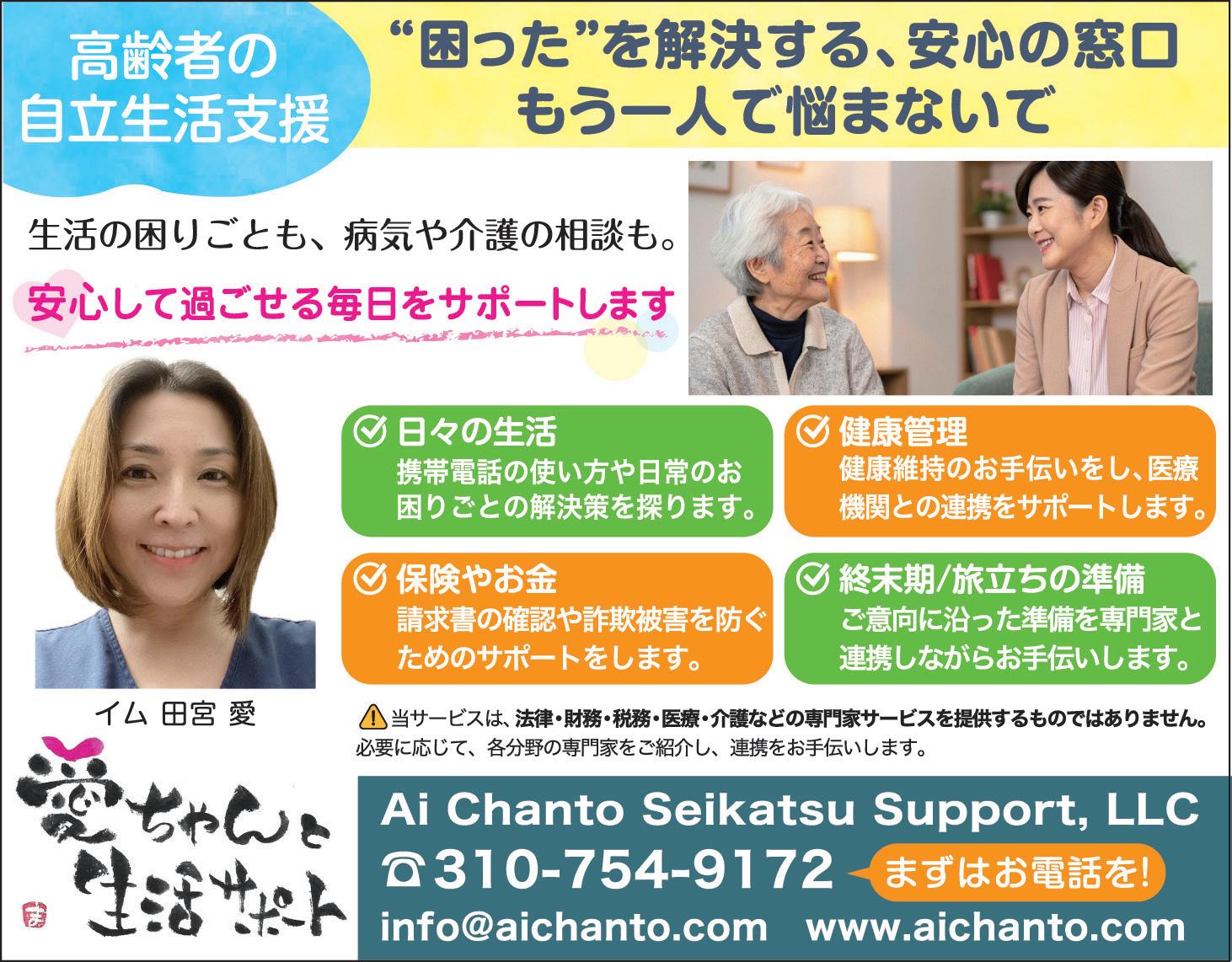 高齢者の自立生活支援セミナー シアトルのサービス付き高齢者向け住宅、日系マ ナーが、高齢者の生活上の困りごとをテーマにセミ ナーを開催。THT Harmonyの終活アドバイザー、 田宮愛さんを迎え、「安心して過ごせる毎日」を送る ための情報を紹介する。日常生活の不安や病気、 介護への備えについて考える機会となる。