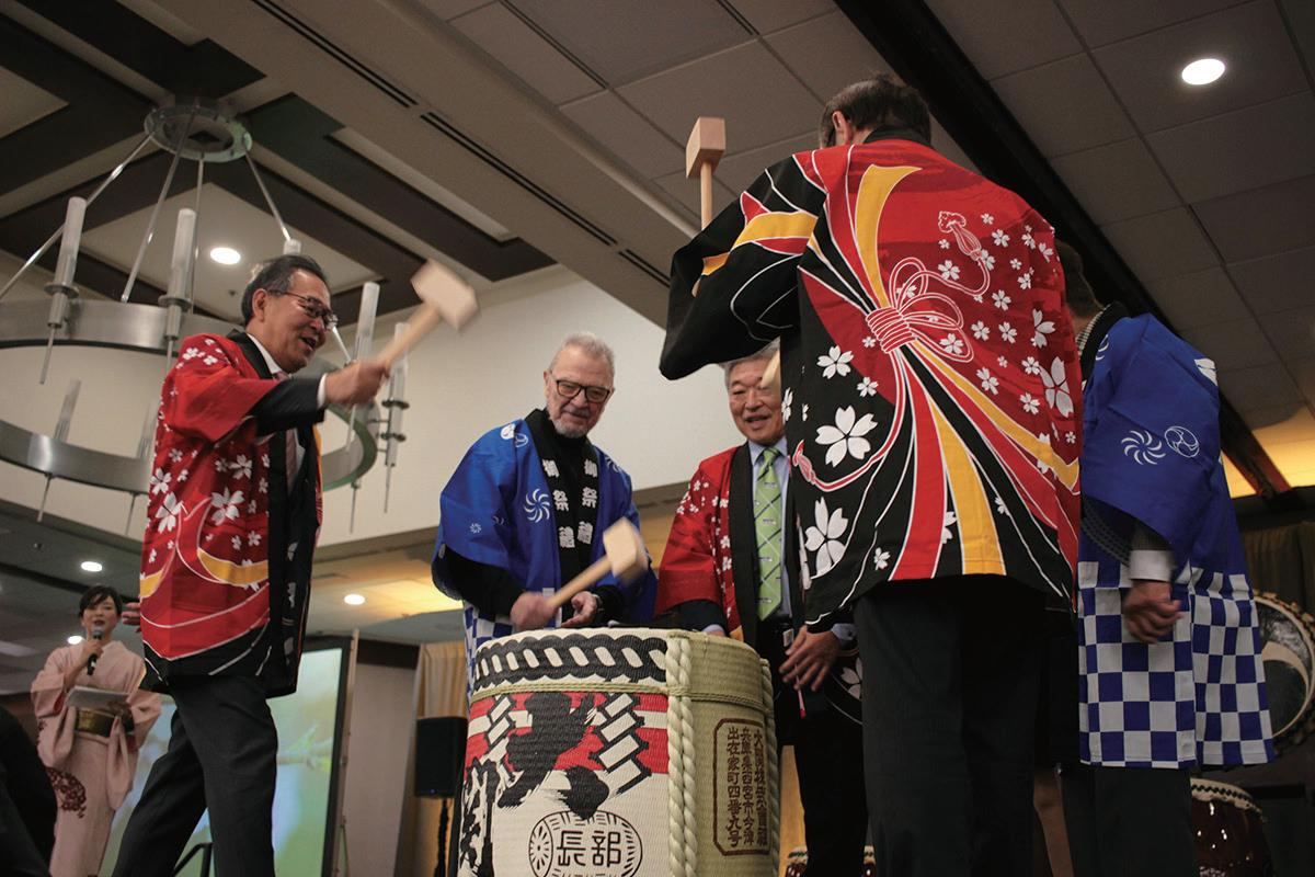 来賓のあいさつに続き、新年の門出 を祝う鏡開きが行われた。場内から 上がる「よいしょ」の掛け声に合わせ て、登壇者が木 きづち 槌を打ち下ろし、会場 は一体感に包まれた。続いて、元駐越 米国大使館大使・元駐日米国首席公 使のマイケル・W・マハラック氏が新 年の祝意とともに、日米関係において 「太平洋に線を引かない」ことの大切 さに触れ乾杯の音頭を取った。