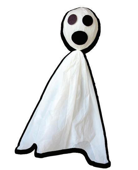 Blow up the balloon until it’s as big as you would like the head of your ghost. Put the balloon in a plastic bag and situate it so that a corner of the bottom of the bag is at the top of the balloon. Tie the bag just below the bottom of the balloon. The rest of the bag will drape like the ghosts’ body. Cut out facial features from black construction paper. Either glue or tape these in place. Make a hole in the top of the bag (make sure you don’t pop the balloon) just large enough to insert some heavy string. Tie the string tightly and hang your ghost in the house or from a tree branch.