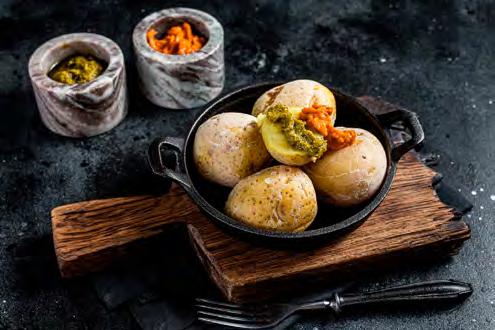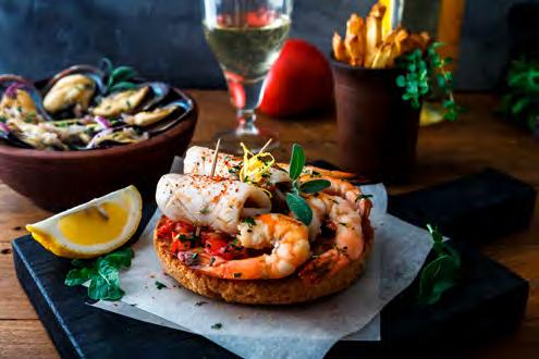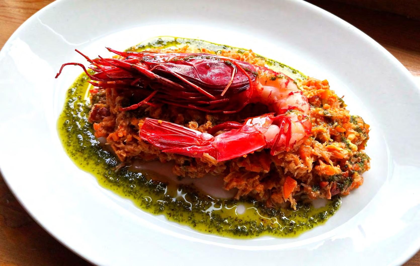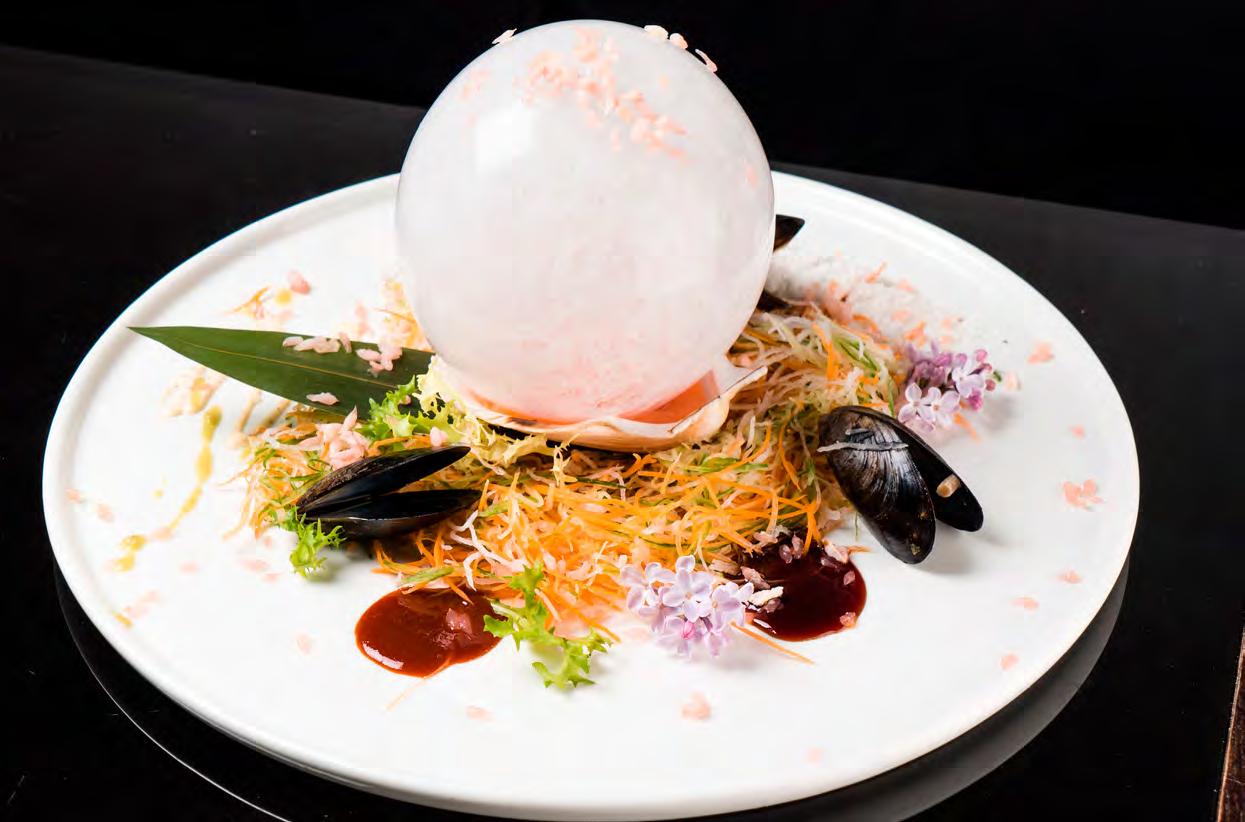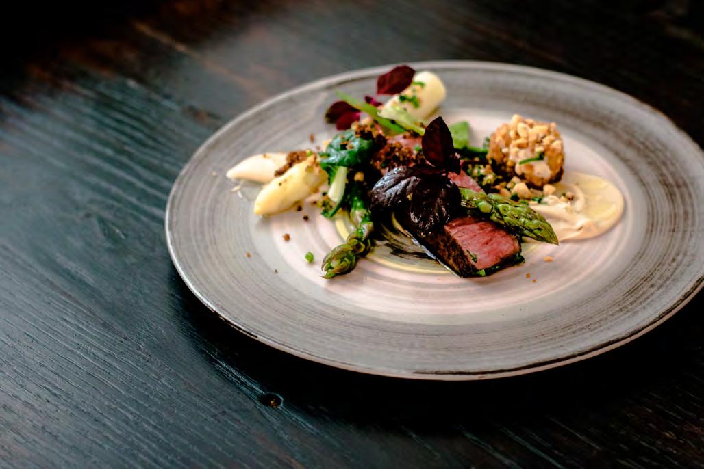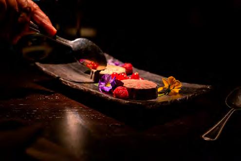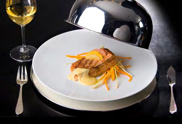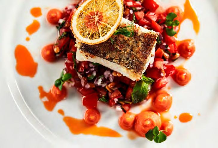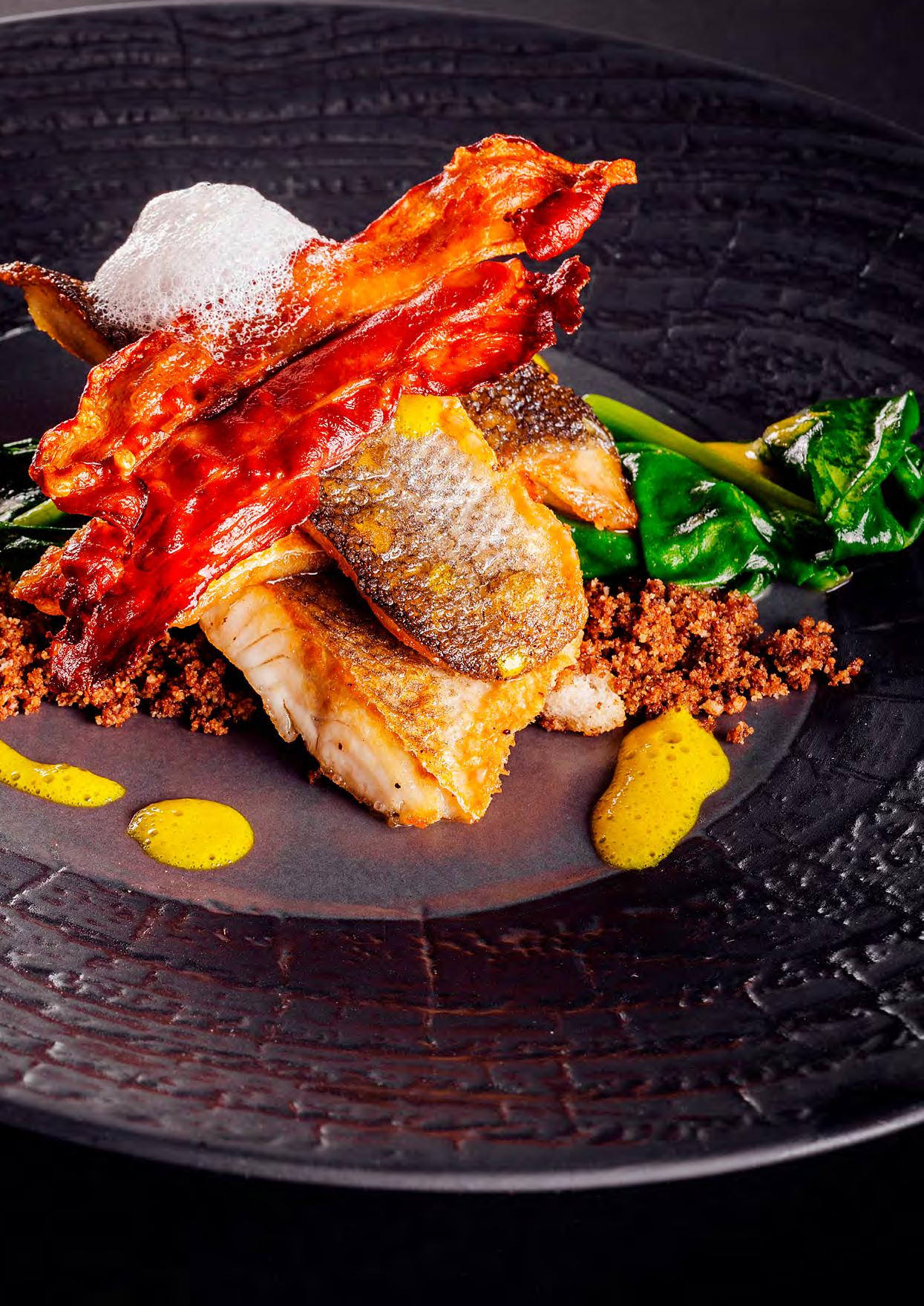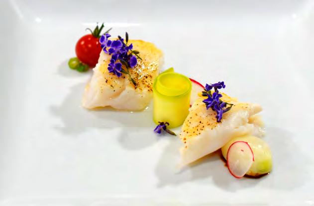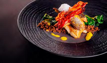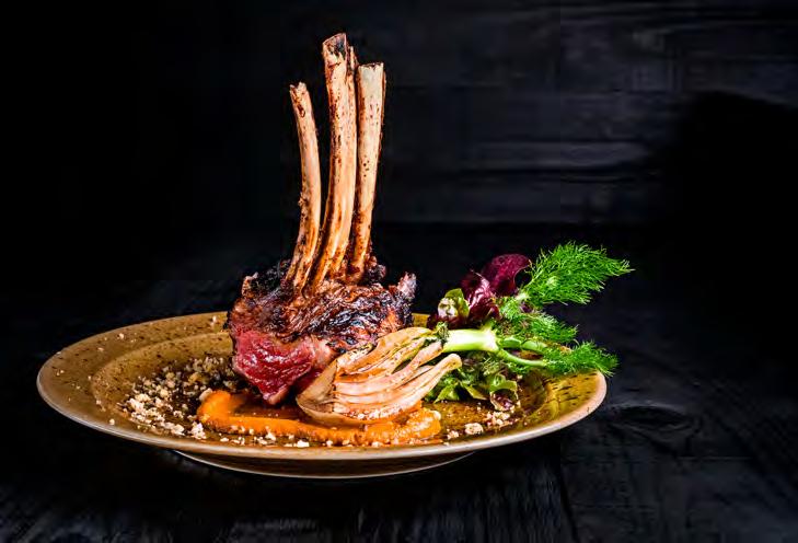 SeebarschïŹlet auf Chardonnay-Spiegel und Piquillo-Paprika Gegrillter Pulpo mit Chimichurri, TrĂŒffel-KartoffelpĂŒree und schwarzer Knoblauchsauce LammrĂŒcken im andinen Marinat mit Kartoffeln und Butter-Bimi SchweineïŹlet gefĂŒllt mit weihnachtlichen FrĂŒchten