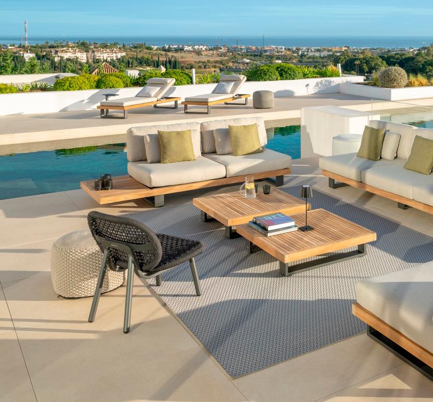 • Trendy und Zeitlos: Die Kollektion 2024 findet die perfekte Balance zwischen Trendigkeit und Zeitlosigkeit. Die Aluminiumfarbe Sand fügt sich nahtlos in jeden Garten ein, sei es rustikal oder modern. Das geflochtene Material in leinenfarbener Seiloptik verleiht einen zeitgemäßen Touch. Und natürlich bleibt Teakholz ein Favorit – warm, hochwertig und zeitlos.