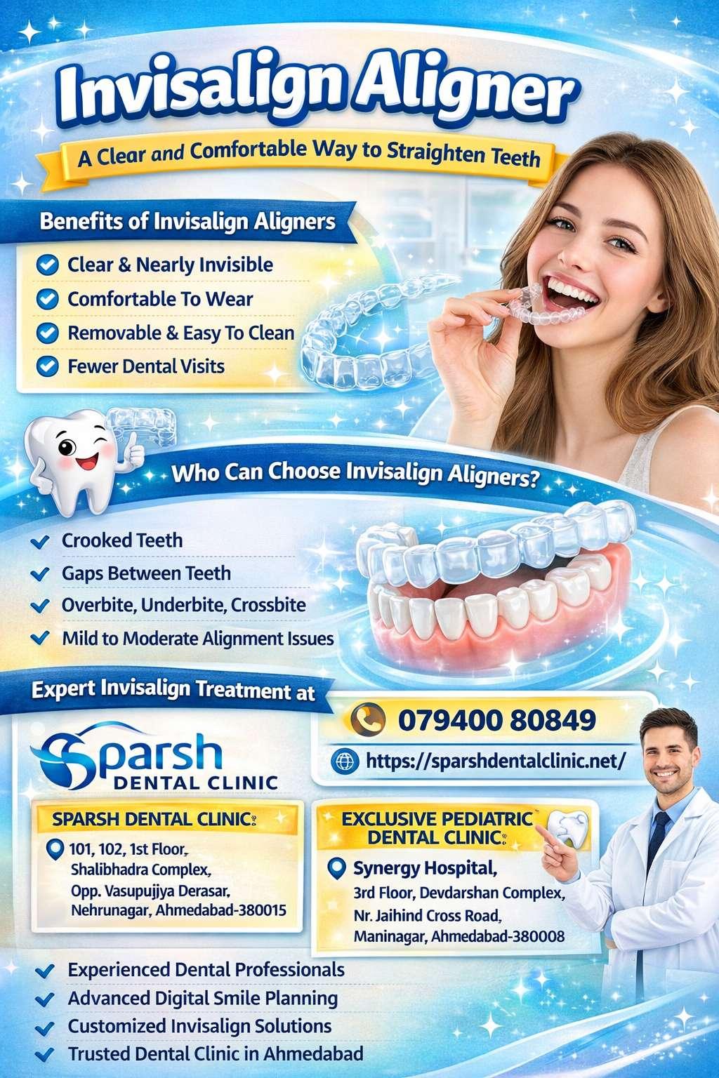 Straighten your teeth discreetly with Invisalign aligners at SPARSH DENTAL CLINIC. Invisalign offers a clear, comfortable, and removable alternative to traditional braces, suitable for teens and adults.