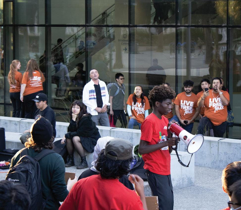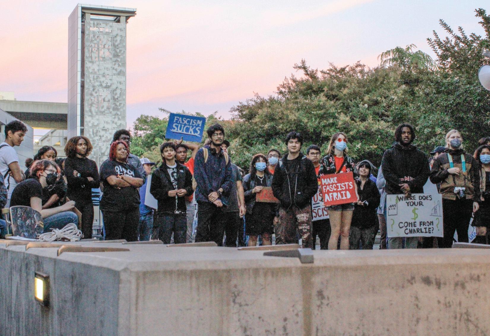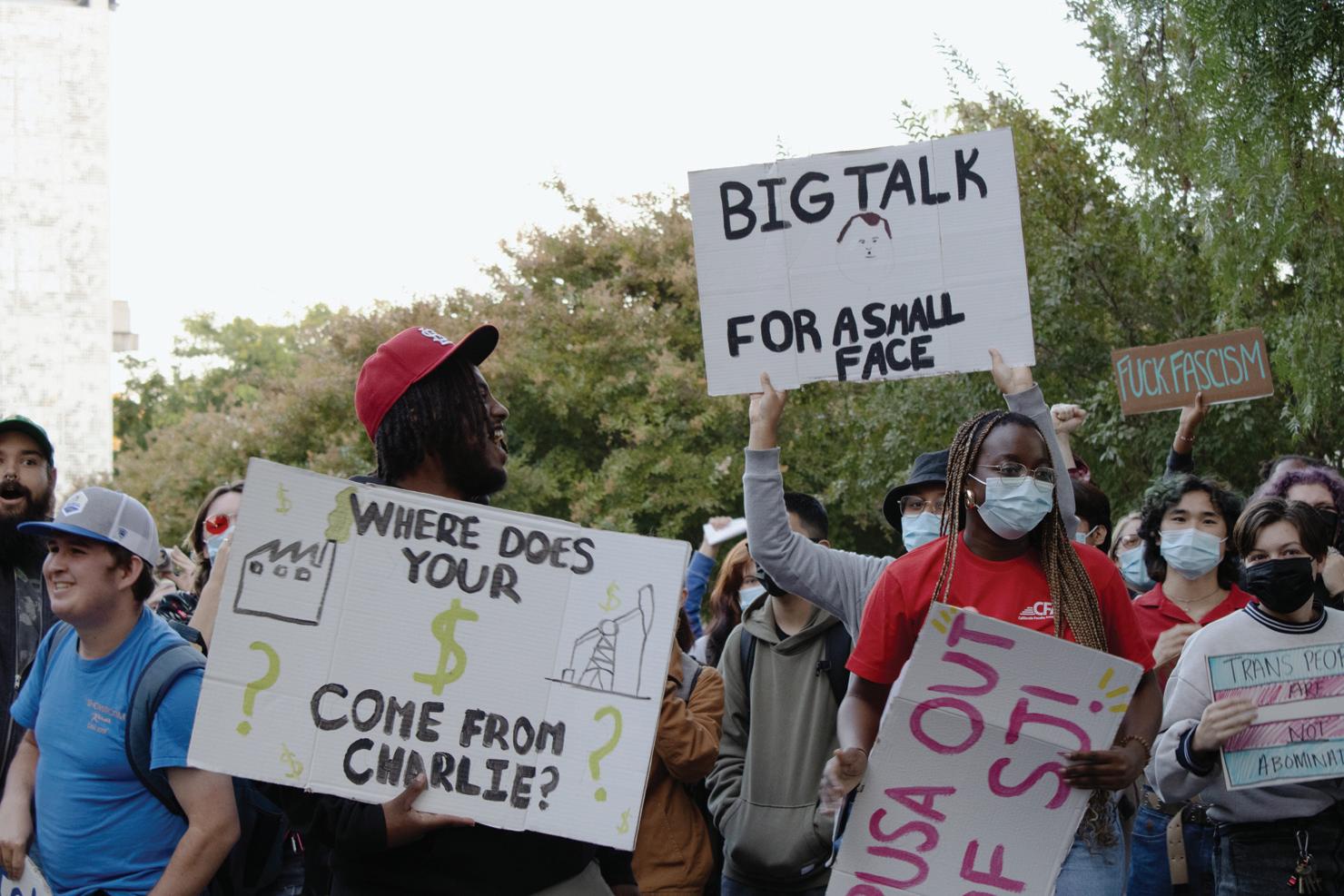 Attendees protest outside of the Student Union on Monday afternoon in response to a Turning Point USA event held on campus.