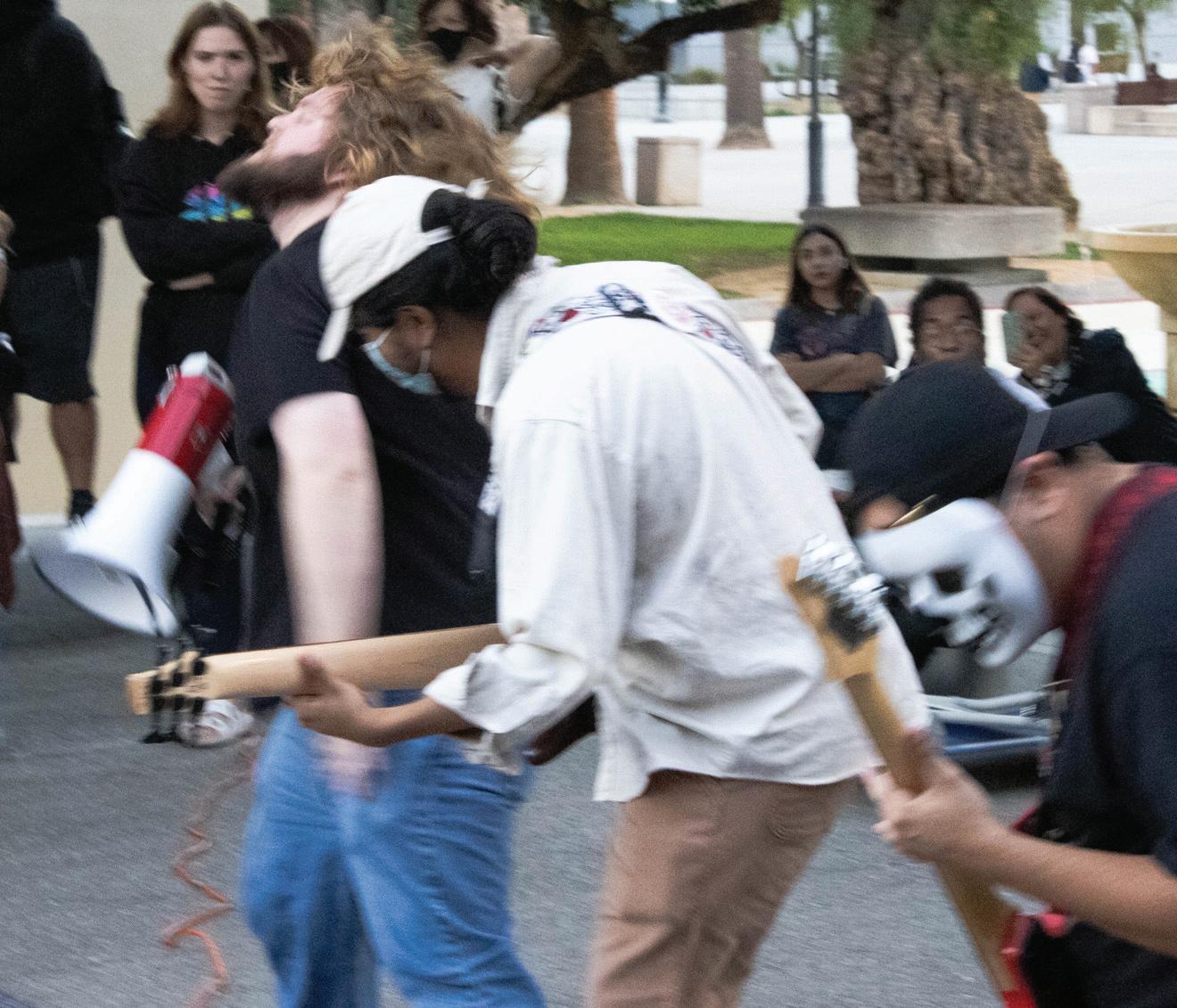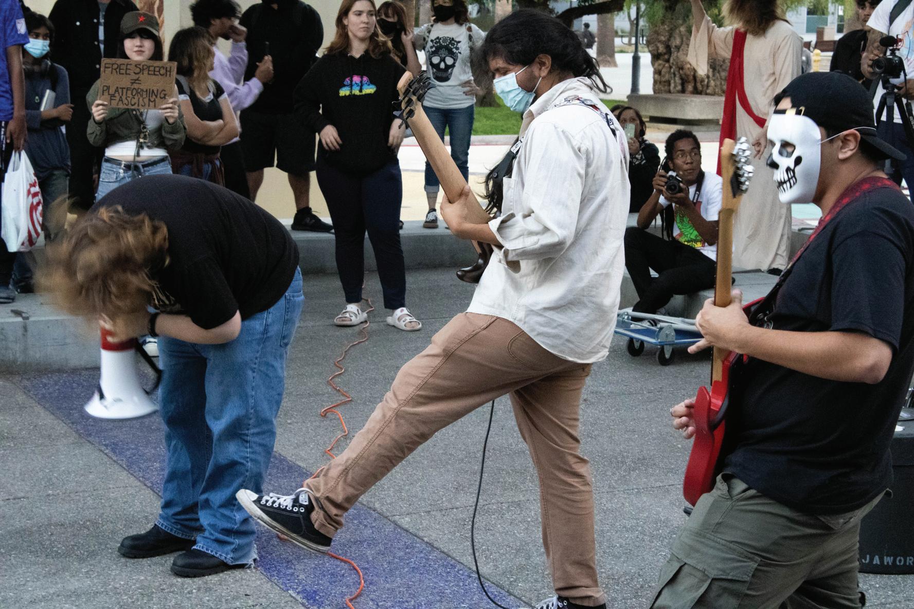 The alternative metal band Polyerius performs on the Student Union patio at the anti-fascism rally on Monday afternoon. 4. A protester leads others through anti-fascist chants.