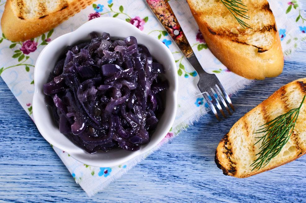 3 onions, red, julienne │ 8 oz butter, unsalted │ 1 cup sugar, granulated ¾ cup red wine vinegar │ 1 cup red wine vinegar │ salt and pepper to taste
