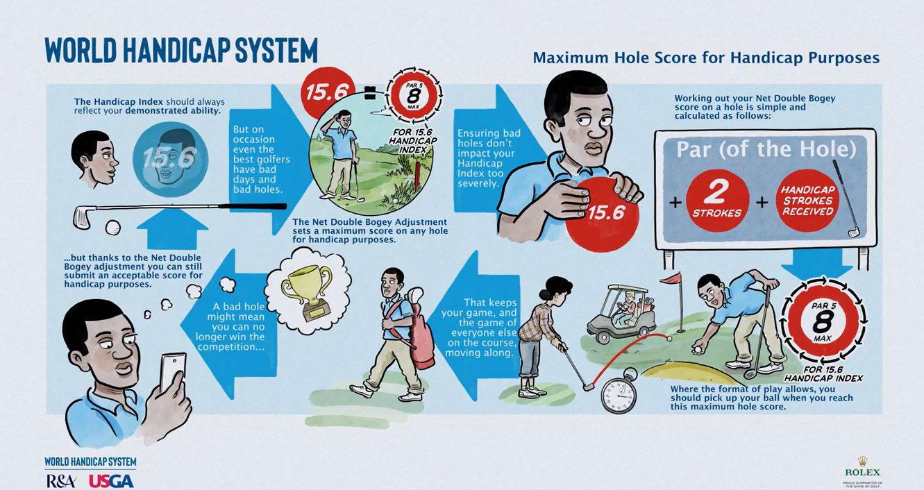 3. Net Double Bogey. The maximum hole score for each player will be limited to a Net Double Bogey. This adjustment is more consistent from hole to hole than the Equitable Stroke Control procedure. Net Double Bogey is already used in many other parts of the world and the calculation is simple: Par + 2 + any handicap strokes you receive.