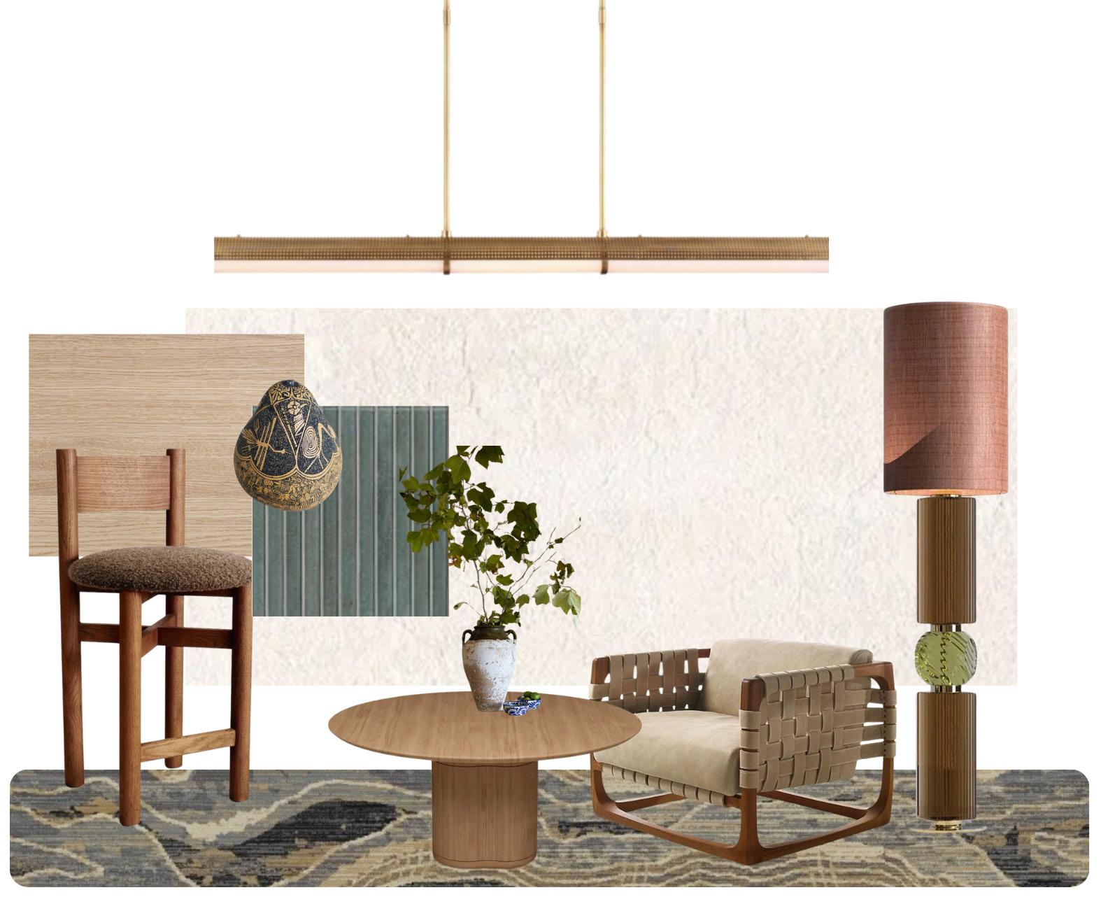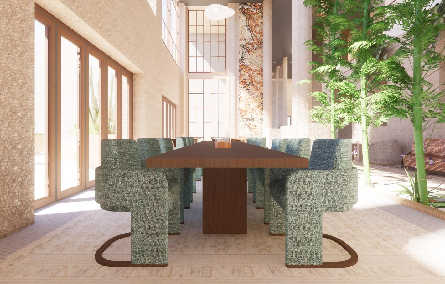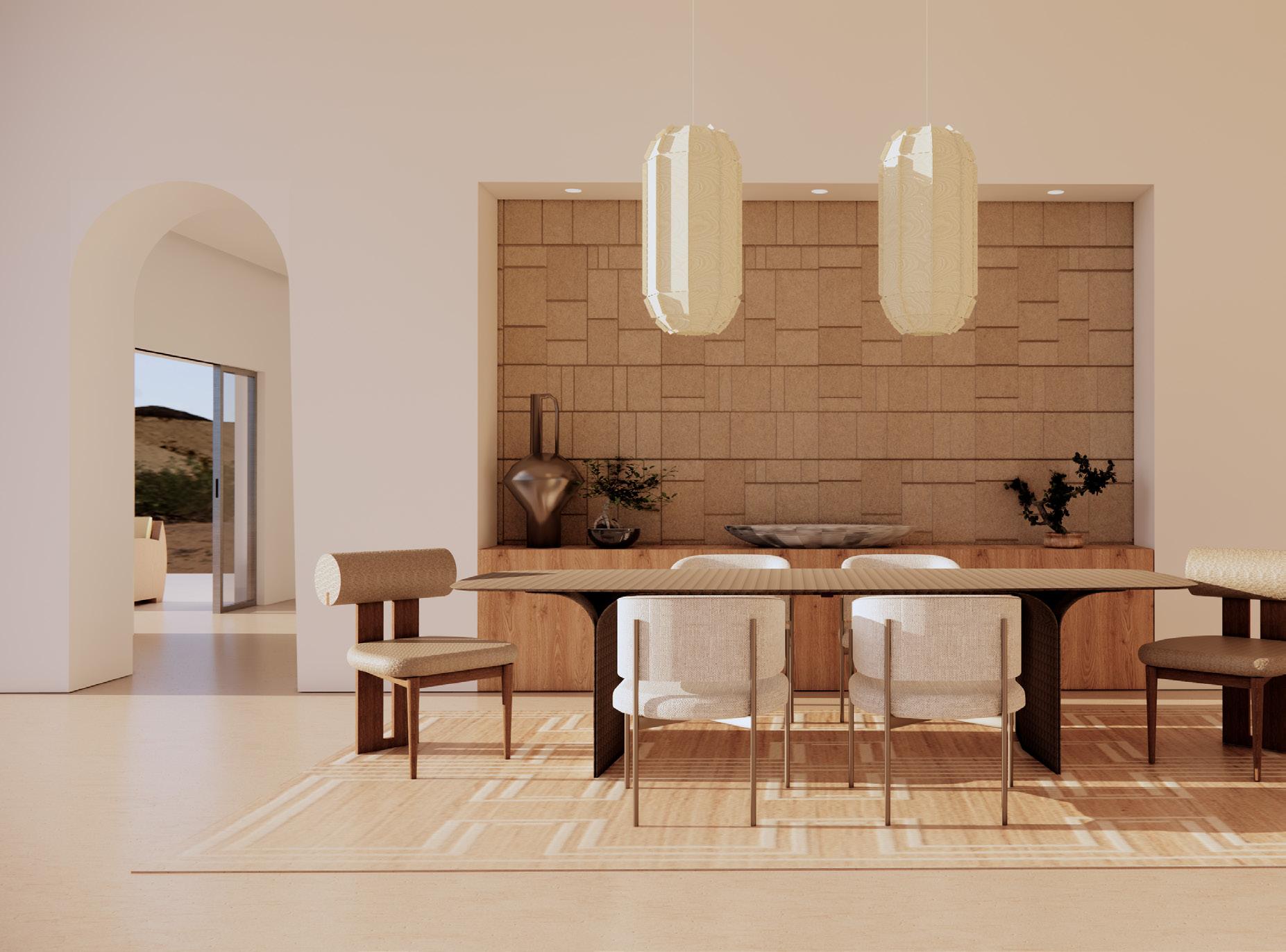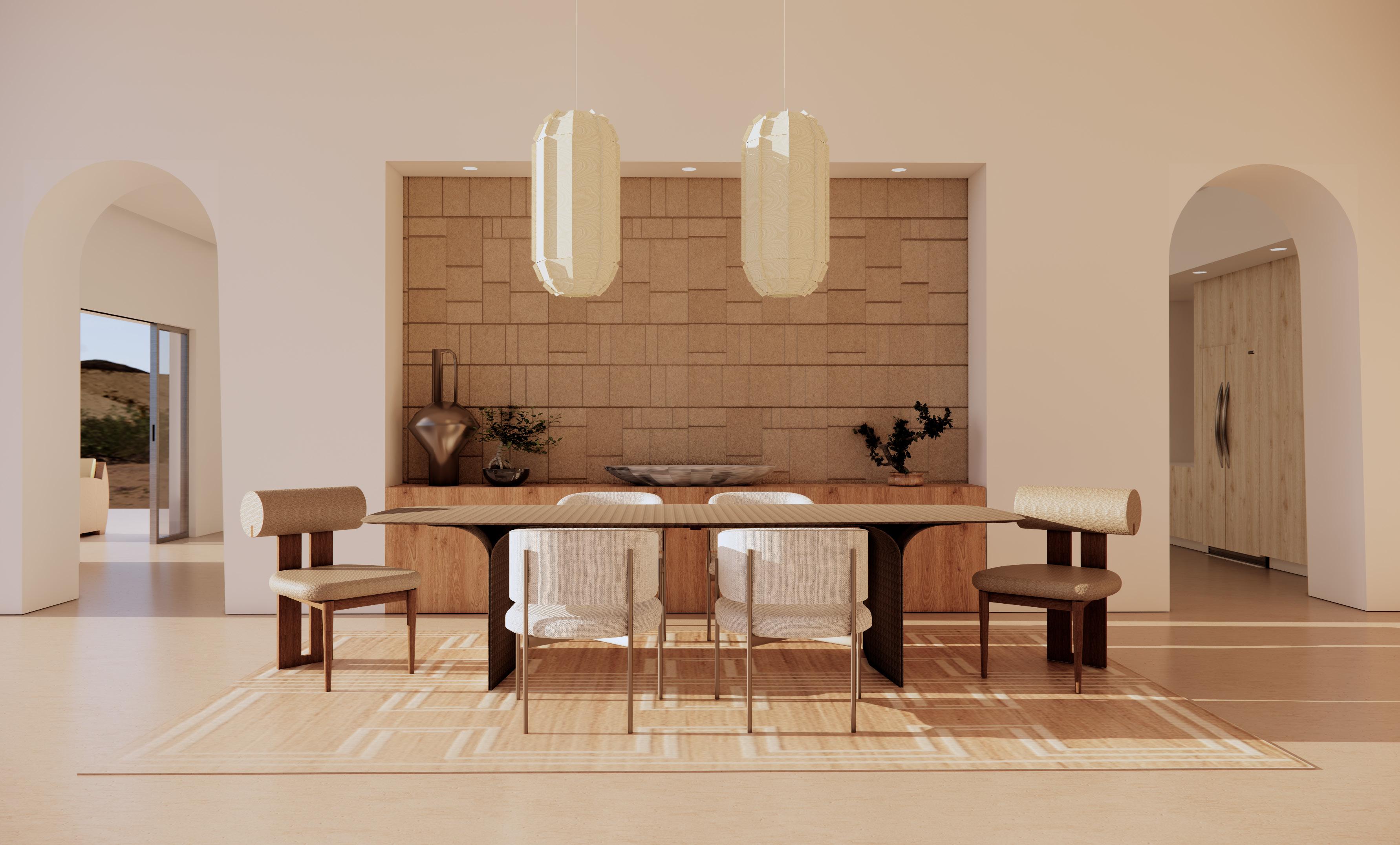 My intention was to lead with organic materials and soft geometry. The dining table anchors the dining room with sculptural, curved legs that feel substantial but not heavy; Paired with a mix of seating to keep the space from feeling too formal or rigid. The upholstered chairs bring lightness and comfort, while the solid wood armchairs at the ends add warmth and a sense of craftsmanship. Its color paletteālayering sand, clay, and warm neutral tones to echo the surrounding environment. The textures do most of the work here: natural wood grain, woven upholstery, and the subtle pattern of the area rug create depth without visual clutter. The rug also helps define the dining zone while reinforcing the roomās strong architectural lines.