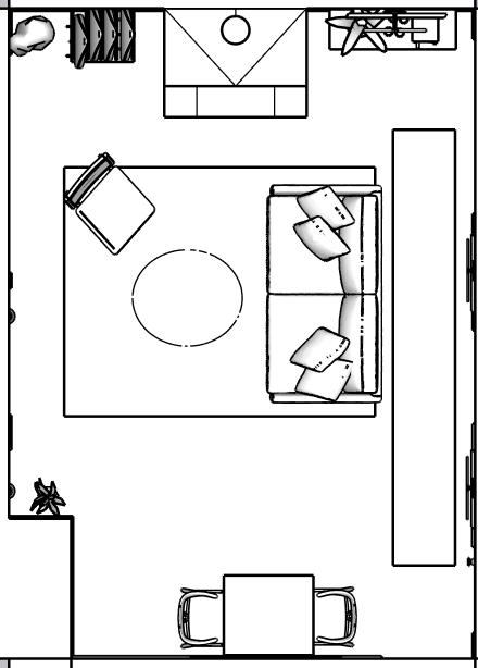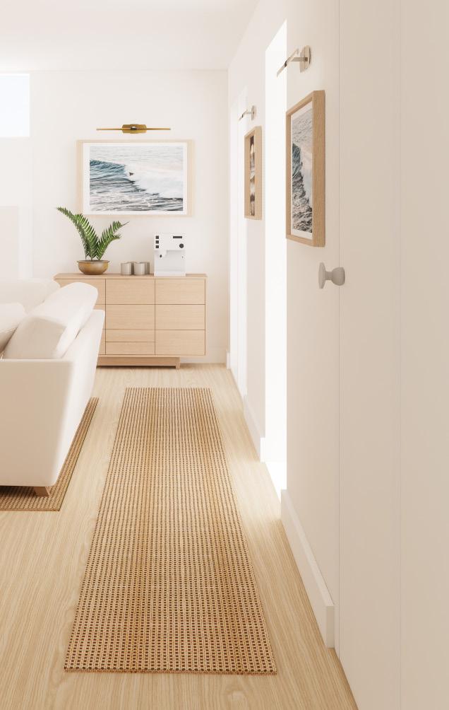 Natural light is abundant becuase of the thoutful design from the existing architecture which features skylights, large sliding glass doors and clerestory windows so when thinking of electric lighting, the goal was to bring in fixtures that would highlight the elements that are important for Ian which I recognized to be his surf prints. Sleek, brass art lights were selected to give his space a sense of sophistication while providing ambiant light and maintaining ample floor space. Underneath his favorite piece of surf photogaphy art rests a console table serving as a bar to display his favorite drinks. creating a welcoming view from the bedroom hallway, In the main living area, space planning was executed with space saving techniques and flow at the forefront. The space was designed for movement, using furniture and floor coverings to section off the space without feeling cluttered or crammed. The sofa, lounge chair, and coffee table are centrally located to anchor the entertainment are.Positioning the sofa to face the South glass doors provides a greater sense of safety so the choice to have an art frame television on the south wall naturally followed.