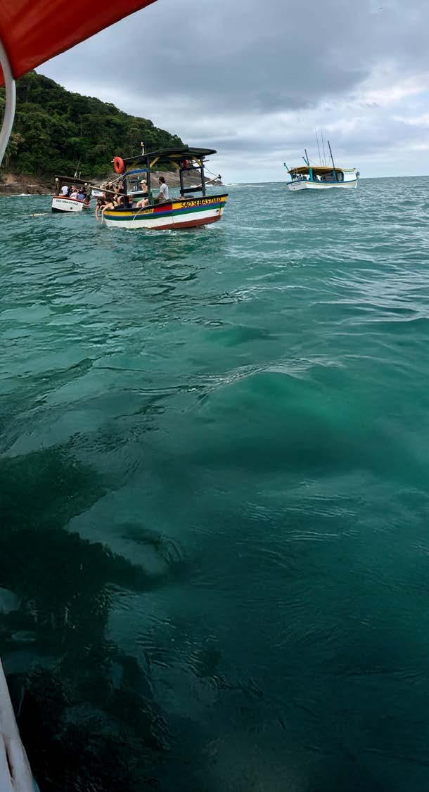 A seguir, a bordo da lancha Terapia, o grupo navega pela Baía de Tabatinga passando pelas ilhas do Tamanduá e da Cocanha. A navegação é contemplação: o mar, as ilhas, o horizonte e o silêncio relativo do oceano compõem uma paisagem que dificilmente se encontra em roteiros convencionais. O ponto de chegada é a Argiloterapia Tabatinga, ritual de cuidado com aplicação de argila branca, que encerra a experiência com um gesto de reconexão com a terra.