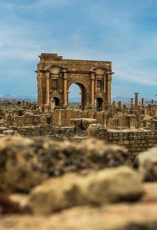 Nestled in the mountains, Tiddis offers a glimpse into Roman urban planning and architecture. Visitors can explore various structures, including a forum, a basilica and a triumphal arch. Spectacularly located, the sandstone constructions at Tiddis have a distinctive ochre-red colour from the deep red of the earth in the surrounding area which is washed down from the hilltop and carried by the wind. The site has been occupied at least since the Neolithic period and several circular ‘bazina’ burial monuments from the pre-Roman Numidian period are visible here. Known as the ‘City of Bridges’ due to its numerous picturesque bridges spanning the Rhumel River, Constantine is a place where history and modernity blend seamlessly. The city is renowned for its dramatic landscape, perched on a rocky outcrop with deep ravines and lush valleys below. Constantine's history dates back to ancient times when it was known as Cirta, a major city of the Numidian Kingdom. It later became a prominent centre of the Roman Empire in North Africa. The city's rich historical heritage is evident in its many archaeological sites, museums, and wellpreserved structures, such as the ancient Roman aqueducts and the Kasbah, a fortress dating back to the Ottoman era.