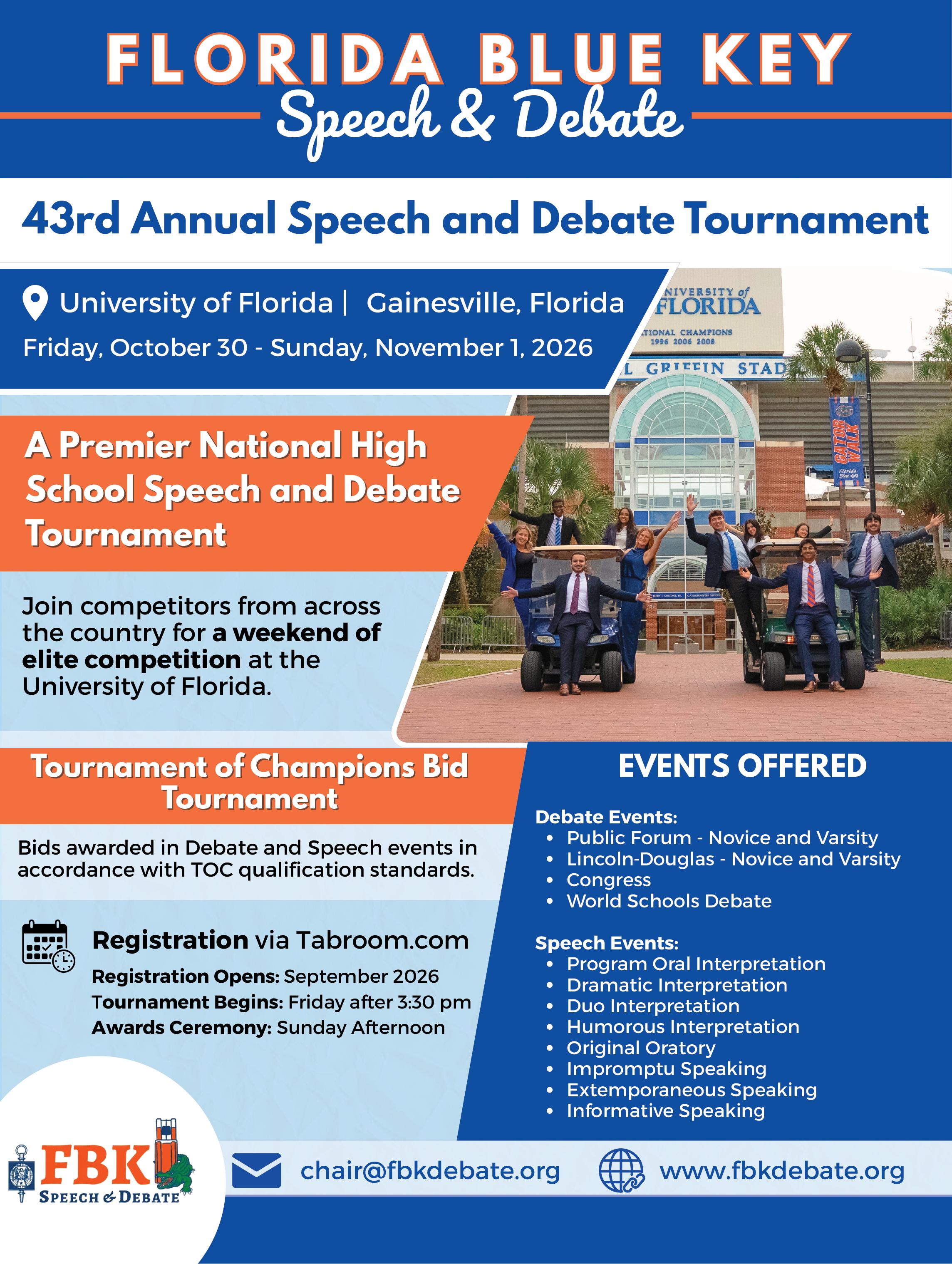 Our annual National Speech & Debate Tournament will be held June 14-19, 2026, in Richmond, Virginia. Tournament info is now available on our website, including tentative schedules, logistics, hotel details, and more. As a reminder, staying in the hotel block saves your team 15% on main event and supplemental event entry fees! We also have day-by-day breakdowns for high school and middle school to get a feel for the flow of the event. Visit www.speechanddebate.org/nationals and use the tabs to navigate around. Read on for updates on safety measures and venue policies.