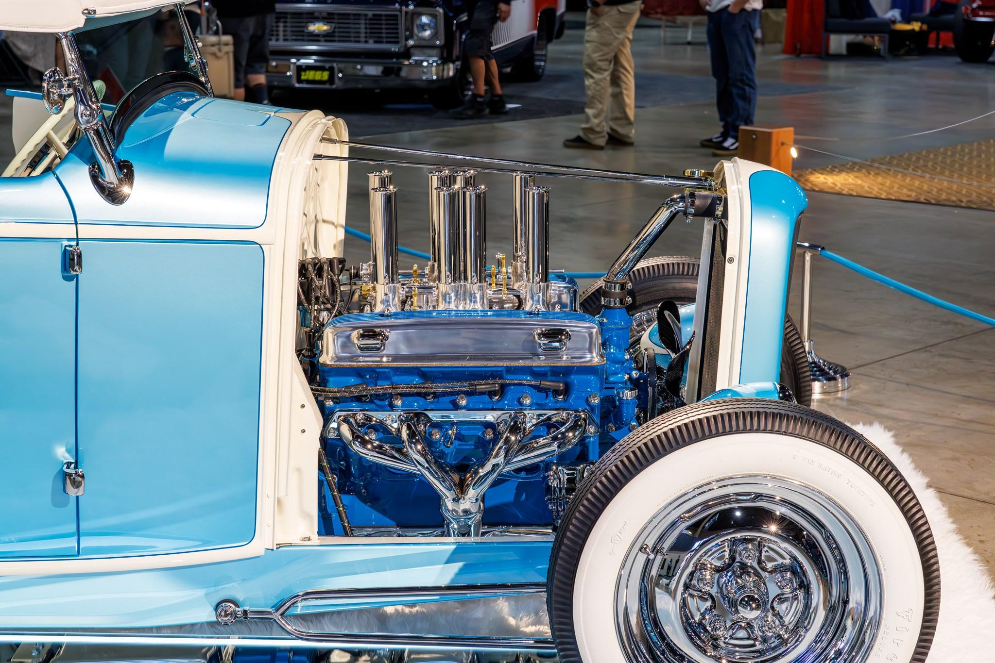 A descendant of the Ford Motor Co. family, Baird presented a meticulously executed roadster finished in metallic blue pearl with white scallops detailed finishes. The paintwork was completed by Tracy and Terry Weaver, complemented by extensive chrome by Jon Wright & Ogden Chrome and polish from Russell’s Custom Polish. Power is supplied by a Buick Nailhead V-8 built by Roger Beckman, while the interior was crafted by Recovery Room.