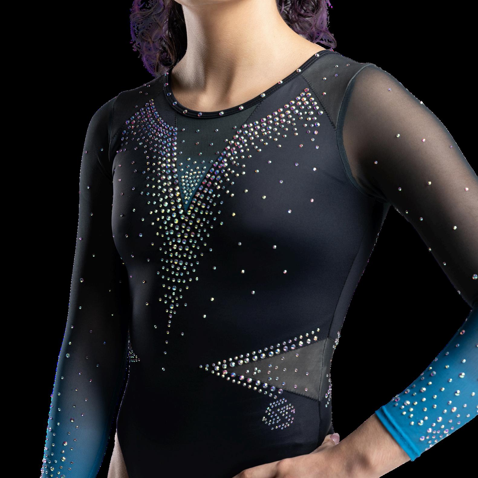 The color turquoise is strongly associated with success and good fortune. Wearing this radiant color can help boost team spirit and add the perfect pop of color during a meet. This beautiful leotard is made of matte fabric for the body, enhanced with mystique fabric accents in the same color scheme To add a touch of fun, we have included 6 overlapped straps on the back and a beautiful ombre effect on the mesh sleeves