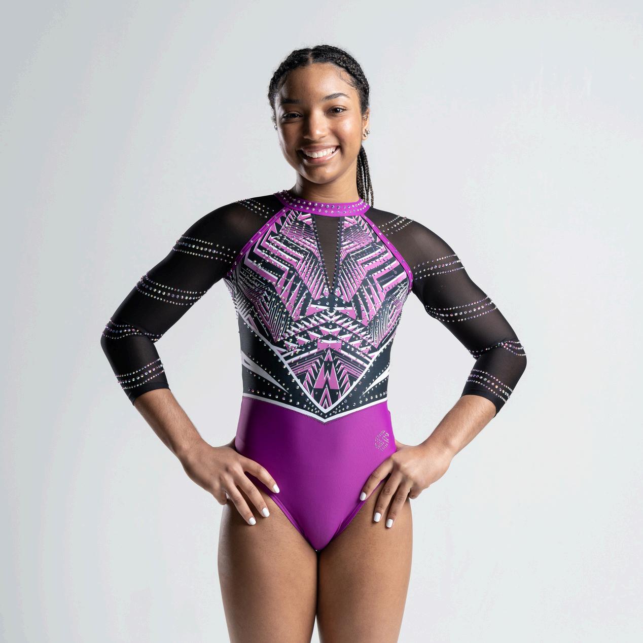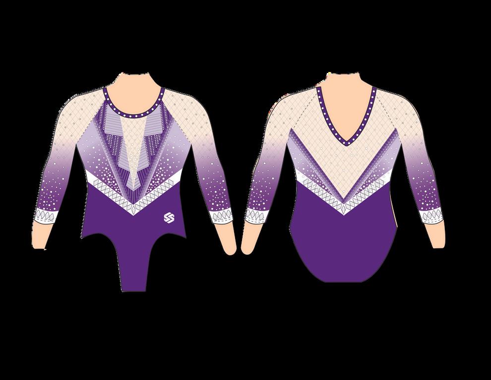 Get ready to stand out in the crowd with the stunning Ella leotard! Its intricate sublimated pattern and dazzling brilliance crystals will catch everyone's eye The front keyhole adds an extra touch of allure, making it the perfect choice for any competition And with its mesh sleeves featuring a beautiful ombre effect from black to purple to white, you'll feel confident and stylish with every routine