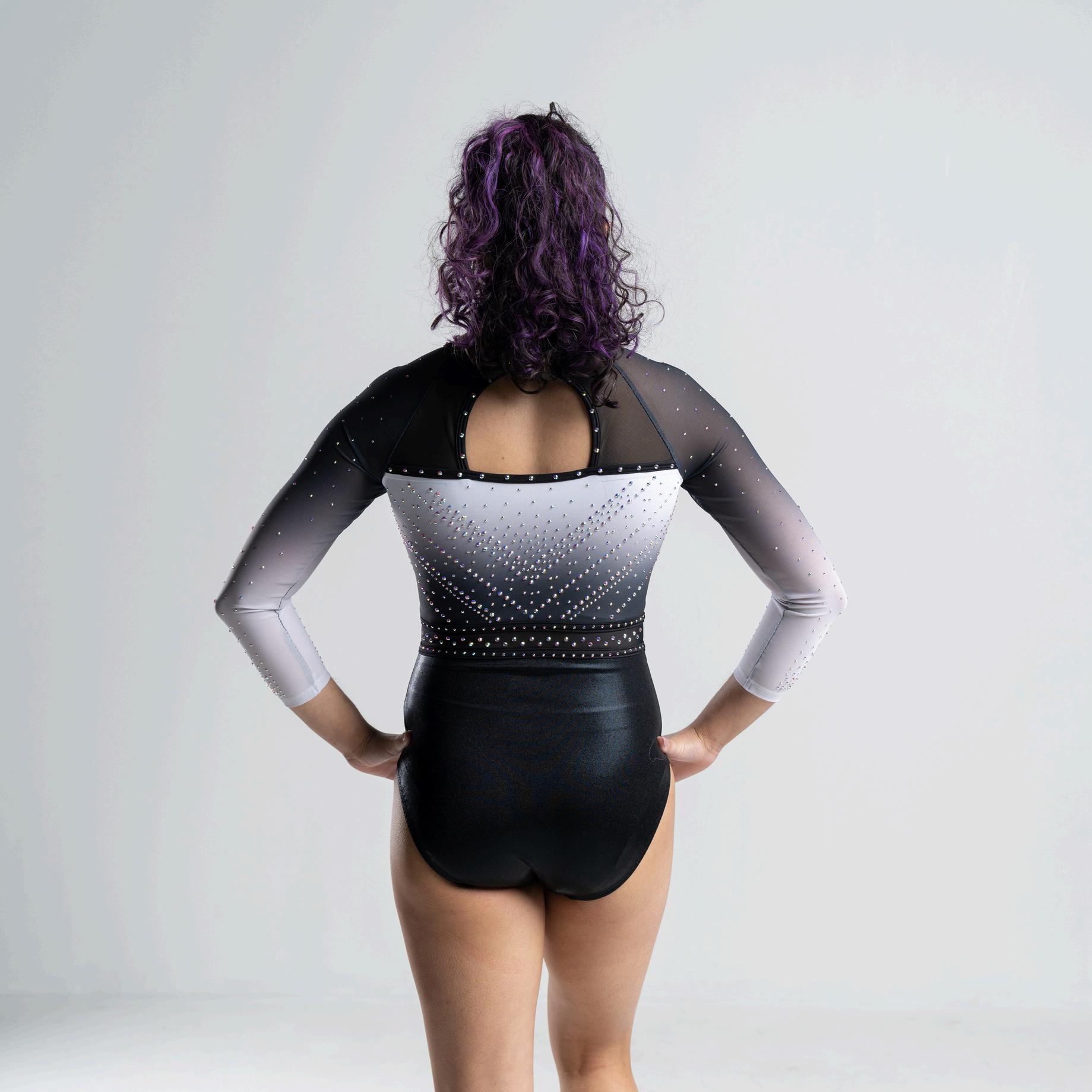 Upgrade your team's performance with our stunning cover selection, the Ella leotard. Our designers have used mystique fabric to give the body a sleek, wet look. The monochromatic color scheme perfectly blends timeless elegance and modern flair. The ombre mesh sleeves are a work of art, transitioning flawlessly from white to black And the manacle bracelets on the wrists, adorned with brilliant crystals, add a touch of sparkle and sophistication With this Leo, your team will not only look good but feel unstoppable.