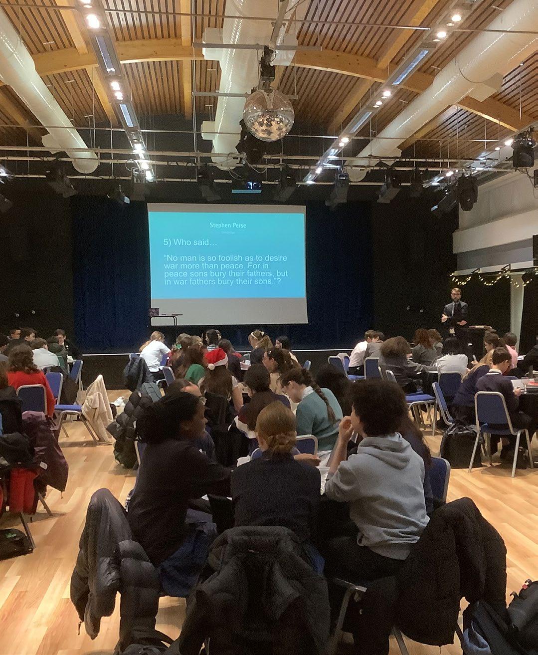 The first quiz we took part in was very jovial, centring around the myths and culture of Rome and Ancient Greece. We were divided into teams of four and were asked questions ranging from the beloved Roman fish sauce to the myth of Arachne. The winning team in this section was Stephen Perse’s Cerberus et Unus, consisting of Molly R, Matilda S, Grace N, and Alec L (Year 11). In the second quiz, the Latinists were tested