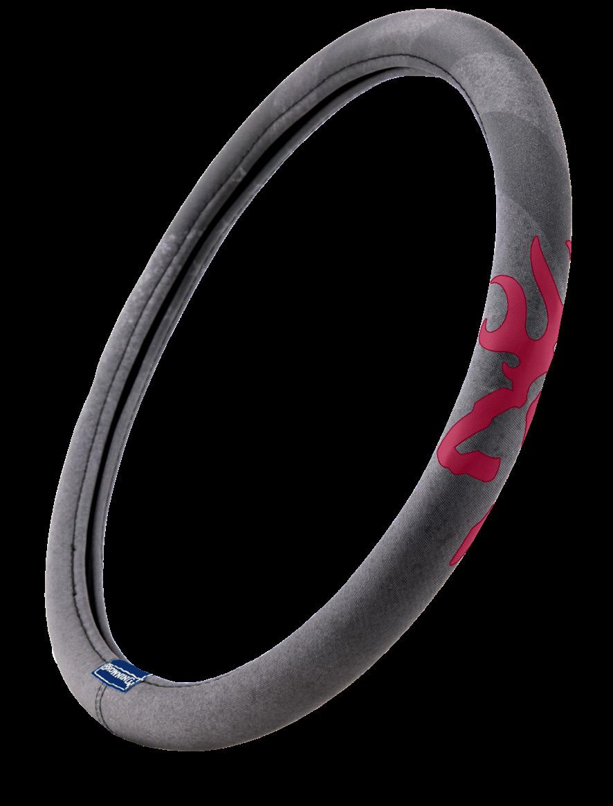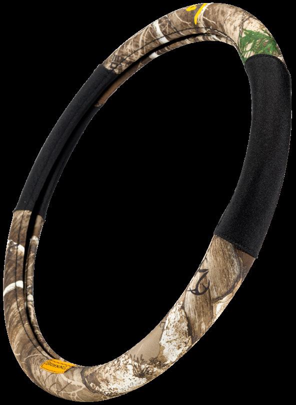 This steering wheel cover features Browning’s Ovix camo with foam-backed microfiber for comfort and translucent PVC for enhanced grip. A rubber ring ensures a secure fit on most 15"-15.5" wheels.