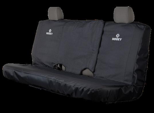 300-denier polyester with water resistant coating · Protects against stains and damage · Embroidered "Hooey" logos · Four-corner-fit™ · Built-in access · Fits most full-size bench seats · One bench seat cover per retail package