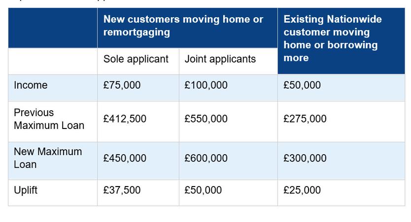 Toqualifyfortheenhancedborrowing,newcustomersmovinghomeor remortgagingtoNationwidewillneedaminimumannualincomeof ÂŁ75,000forsoleapplicants,orÂŁ100,000forjointapplications.