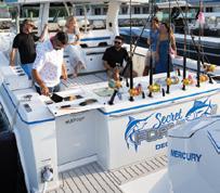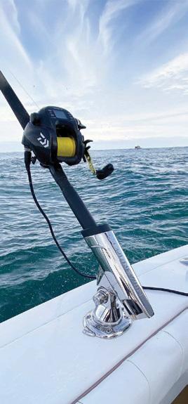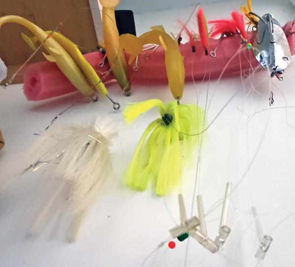 front rod holders, I choose whichever are the lightest of the lures I am trolling that day and make a “half-cast” out to the side or behind me before setting the rod in its holder. The rod that goes in the rear rod holder generally has the heaviest of the lures in the spread and I toss that out with a full cast. By using different weights on the lures and different lengths of line, the lures are separated and less likely to tangle when I make a turn.