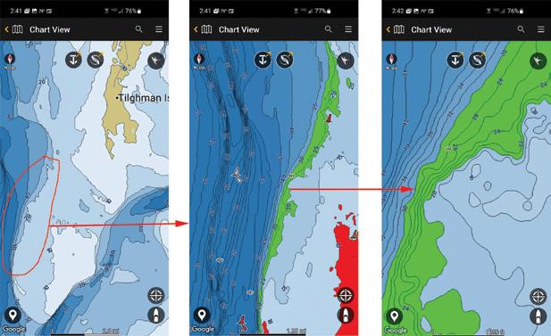 # The craggy drop-off all along the edge the Stone Rock is often hot. Far left imagery shows the general area, with progressive zooming in at about the middle of the Stone Rock zone. High-res bathymetric imagery courtesy of Humminbird Coastmaster charts.