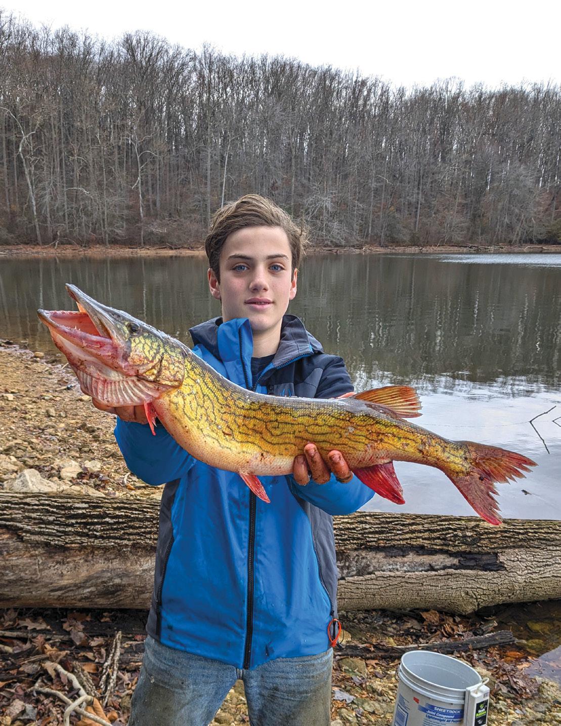 Last winter Miles caught a 26.5” pickerel—and won the Biggest Pickerel and Youth divisions in the CCA Winter Pickerel Championship—while fishing the shorelines of a reservoir. Photo courtesy of Gary Simpson.