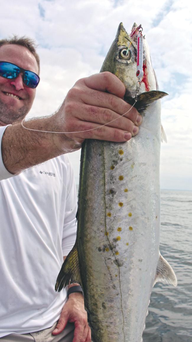 depth range, usually right along the craggy drop-off but also outside of it sometimes when bait gets swept along by the currents and concentrated somewhere near the edge—especially if bluefish and/or Spanish mackerel are in town.