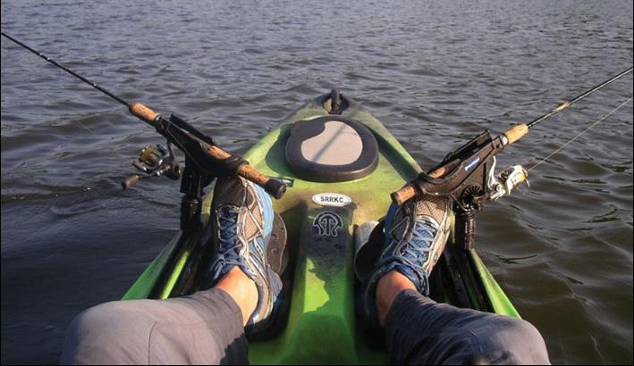 I installed four rod holders on my kayaks, two in front of me and two more behind. They are all in positions where I can reach them easily to rotate them from traveling position to trolling position without straining or leaning out to the side. The two front ones are turned at a 45-degree angle toward the front of the boat and a rear one is turned at a 45-degree angle toward the rear.