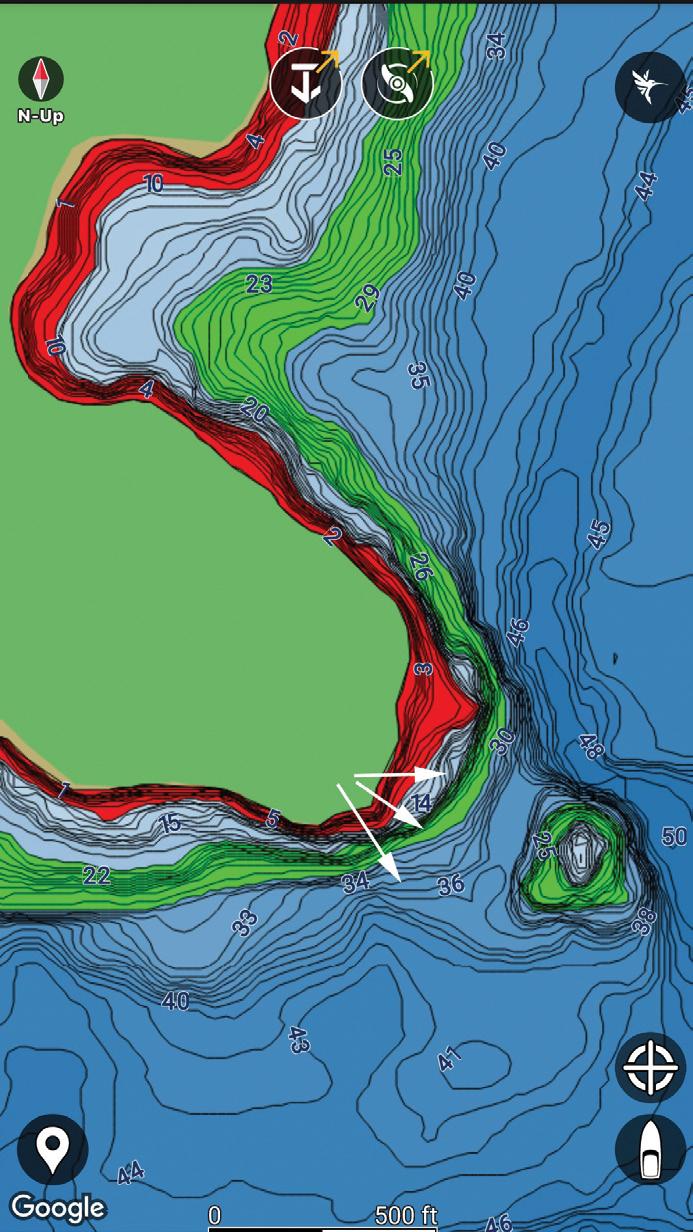 # Look for points that allow you to hit multiple depth zones, including deep water, at the same time. Imagery via Humminbird Lakemaster charts.