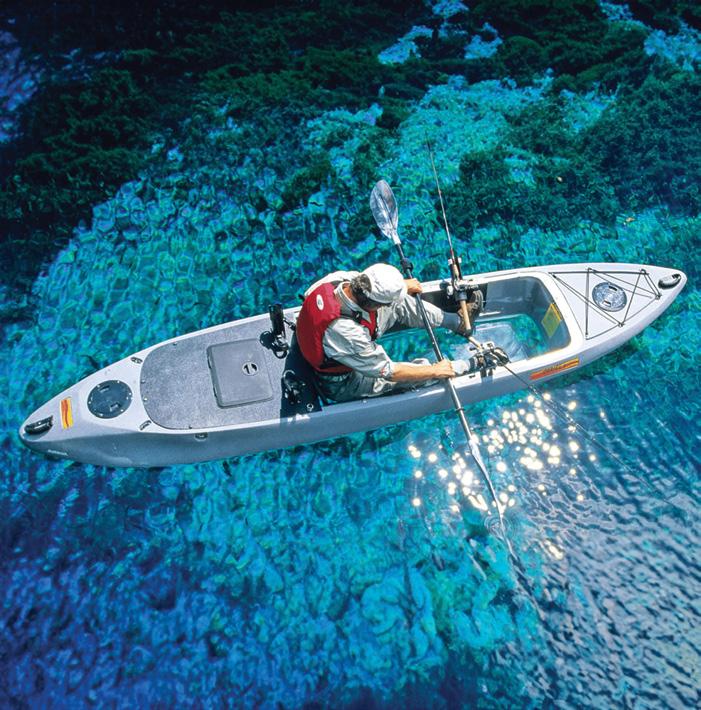 The Passport 10.5 is among the smallest of the dedicated fishing kayaks. It doesn’t have reverse (for that you need to step up a model), nor are there a ton of the integrated features you might find on some larger, more expensive fishing kayaks. But it does deliver that allimportant pedal drive to leave your hands free for fighting fish, a pair of molded-in rodholders, a pair of accessory mounting tracks, and a very comfortable aluminumframed seat. Personally, I love the small size because it minimizes weight, and wrestling 65 pounds in and out of the truck is a lot easier than wrestling 100 or so pounds around for both me and my wife. Critically, it also MSRPs under the $2000 mark.