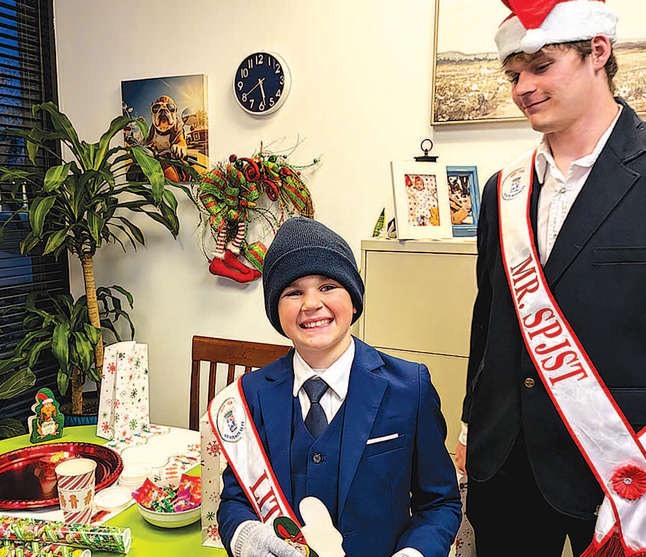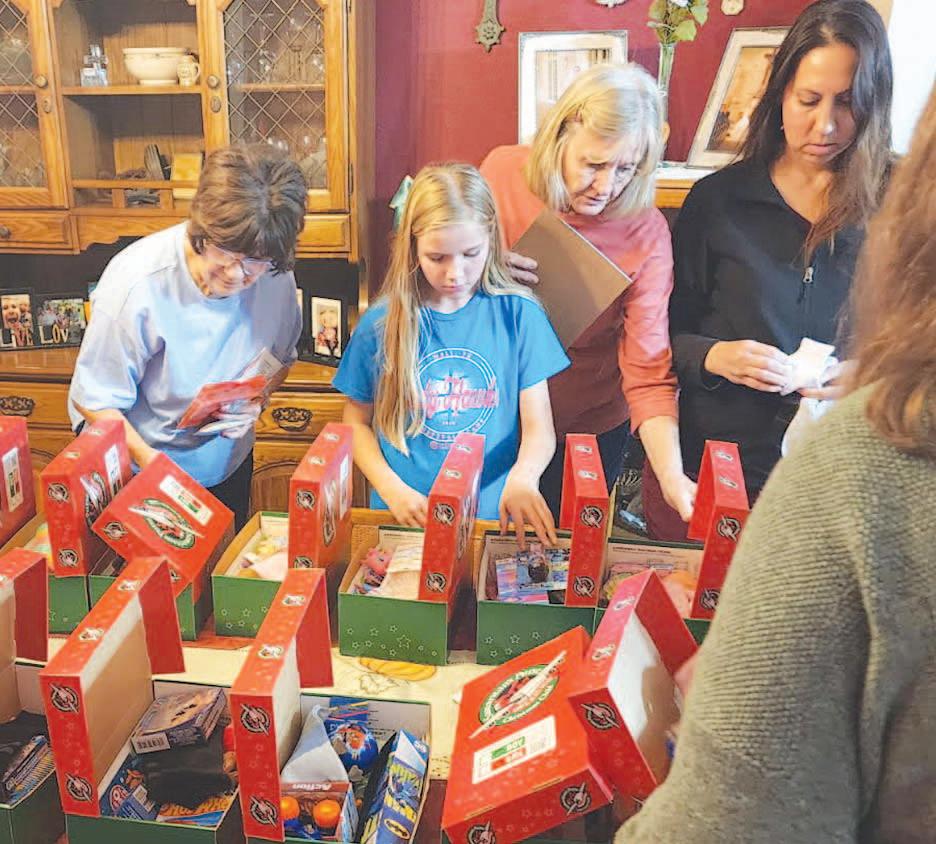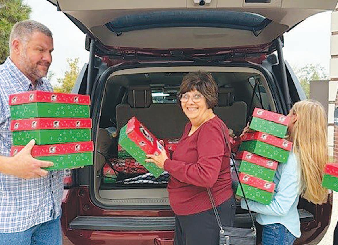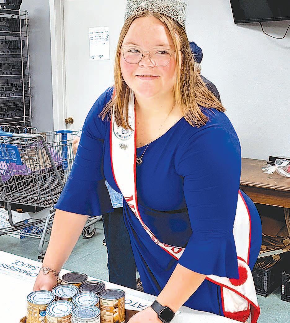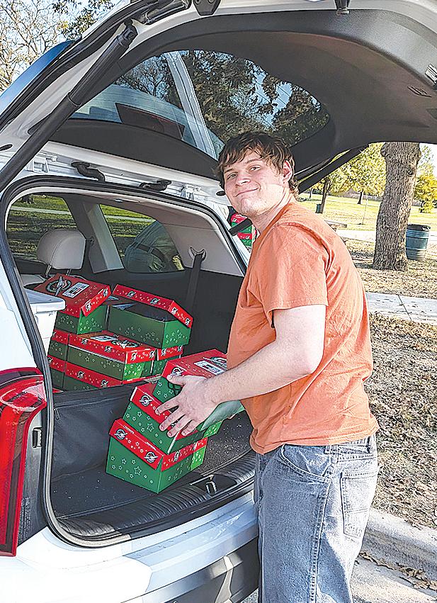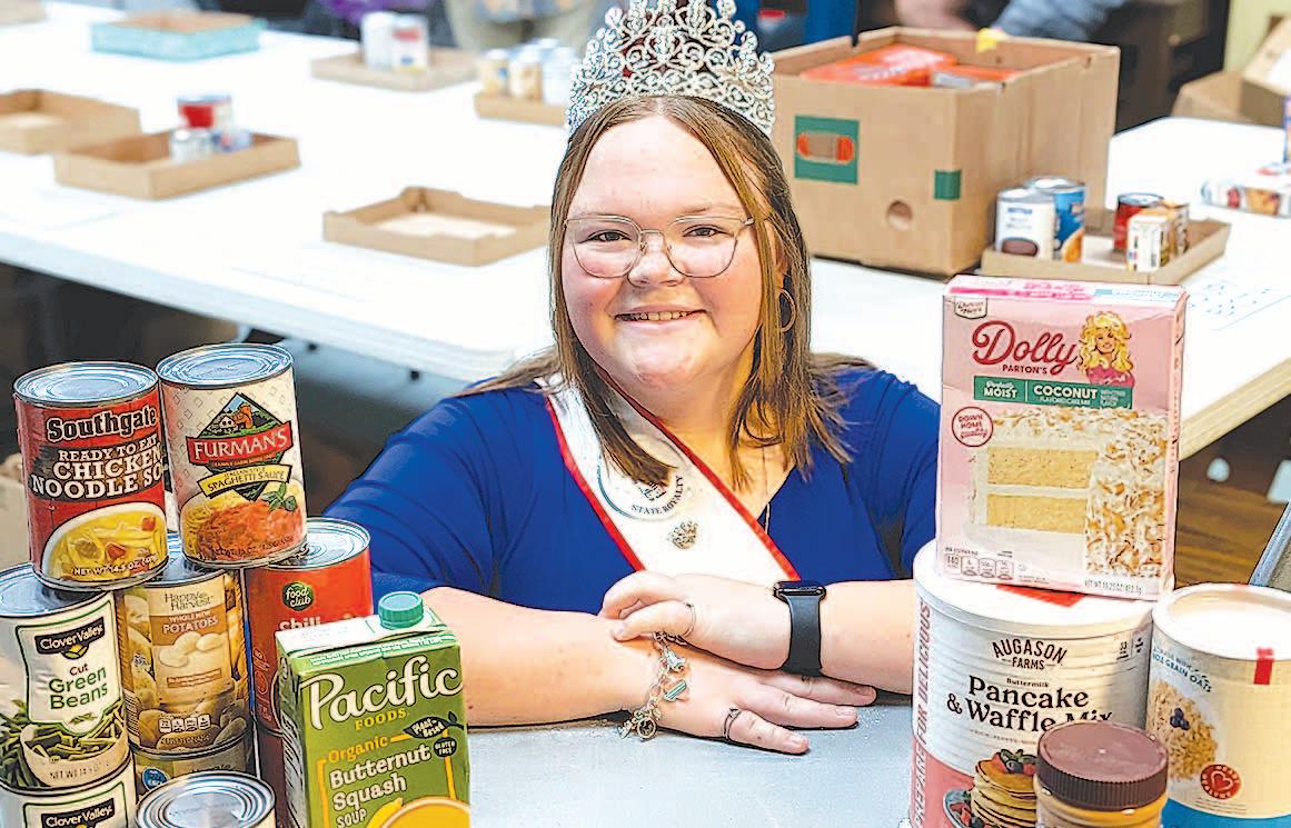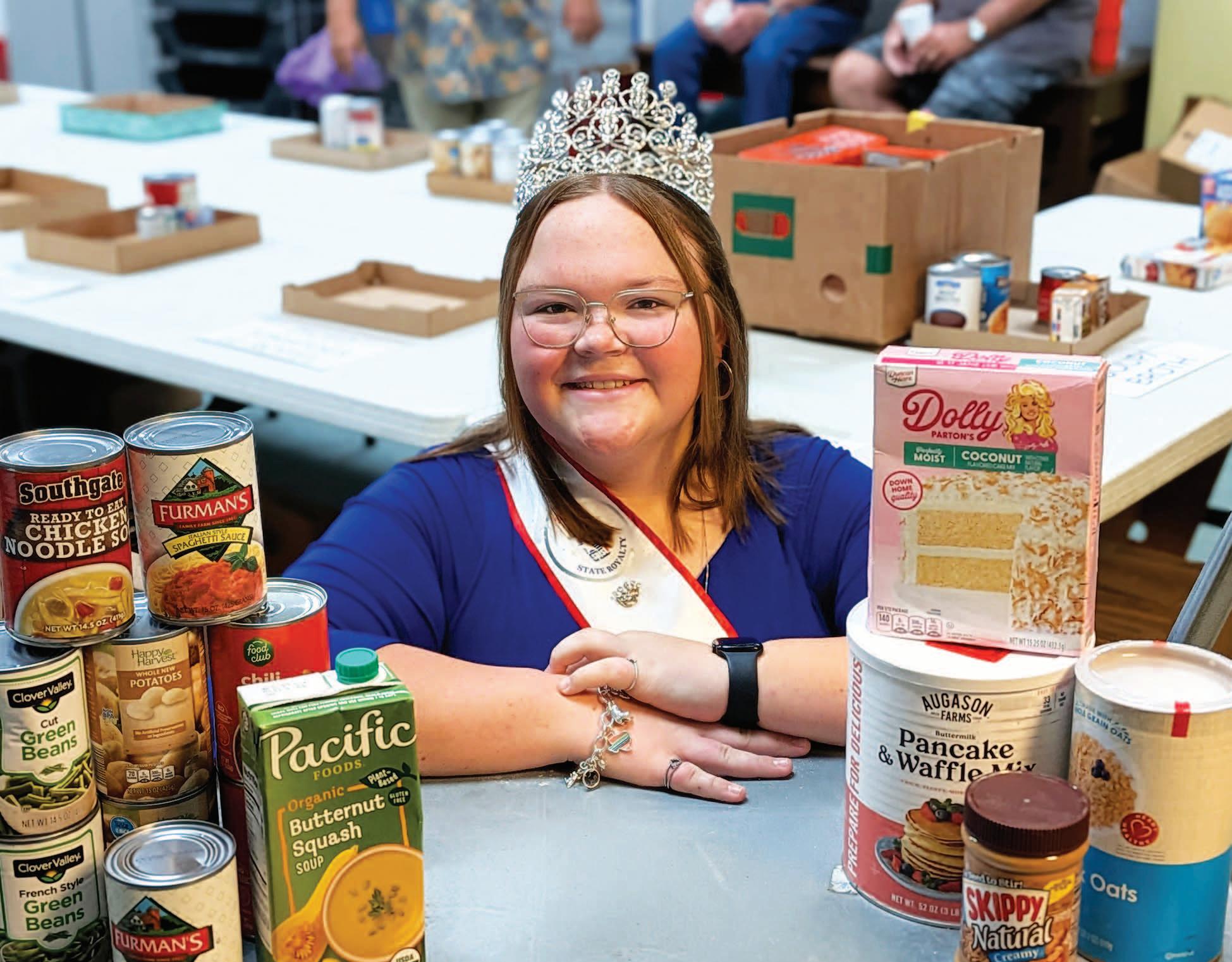 Miss SPJST Paetyn Beckendorf is pictured with canned food donations she helped collect, and Mr. SPJST Levi McAdams fills Operation Christmas Child boxes with his youth leader, Dana McAdams. Their project updates appear on page 26.