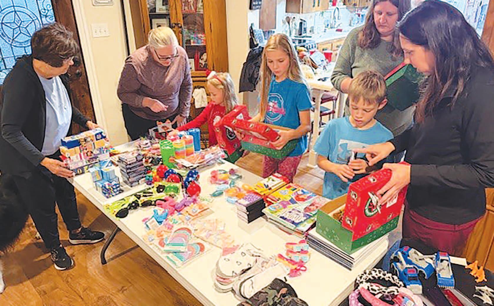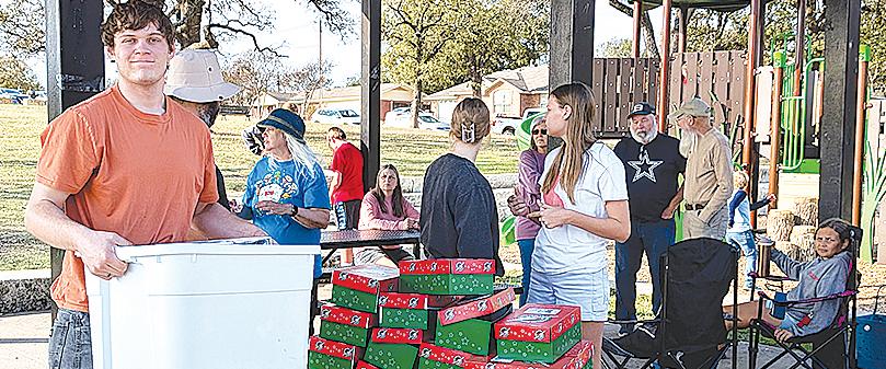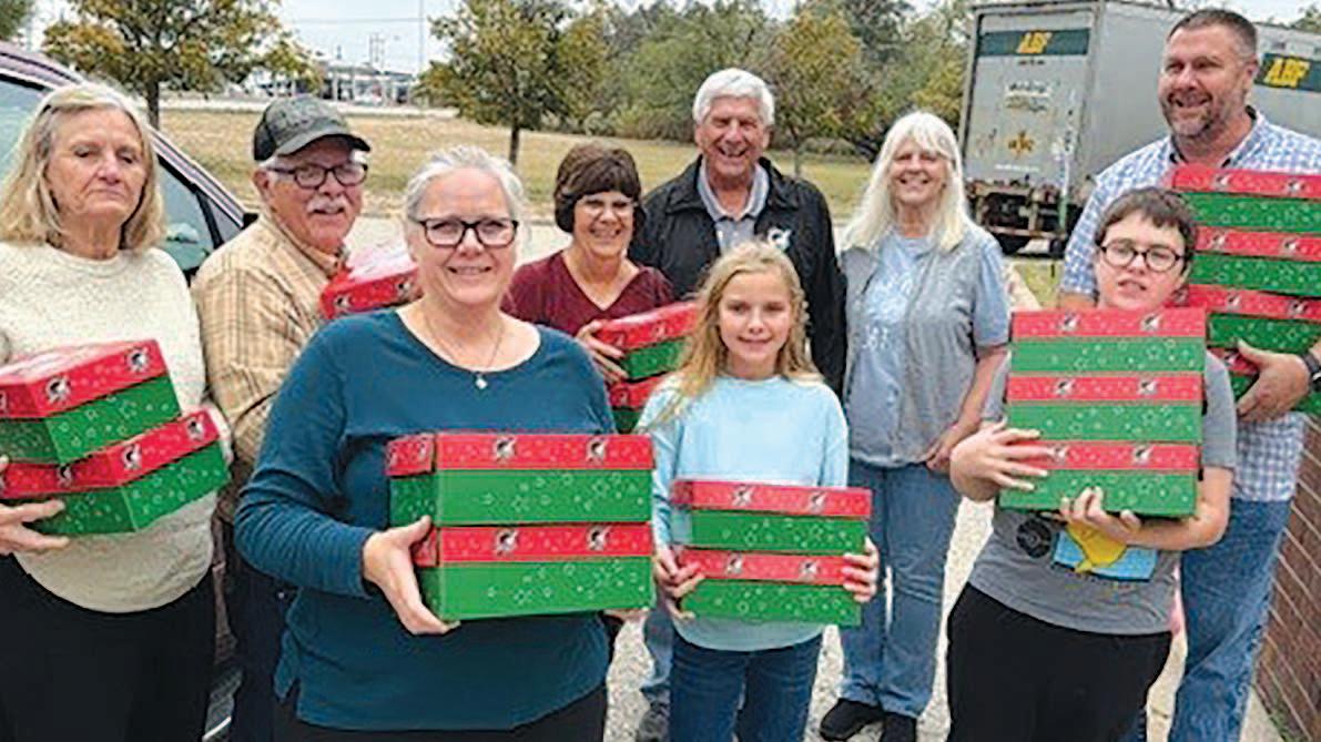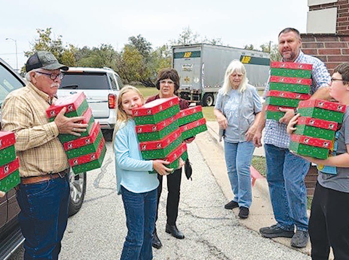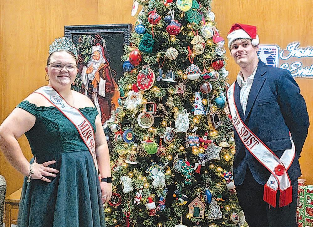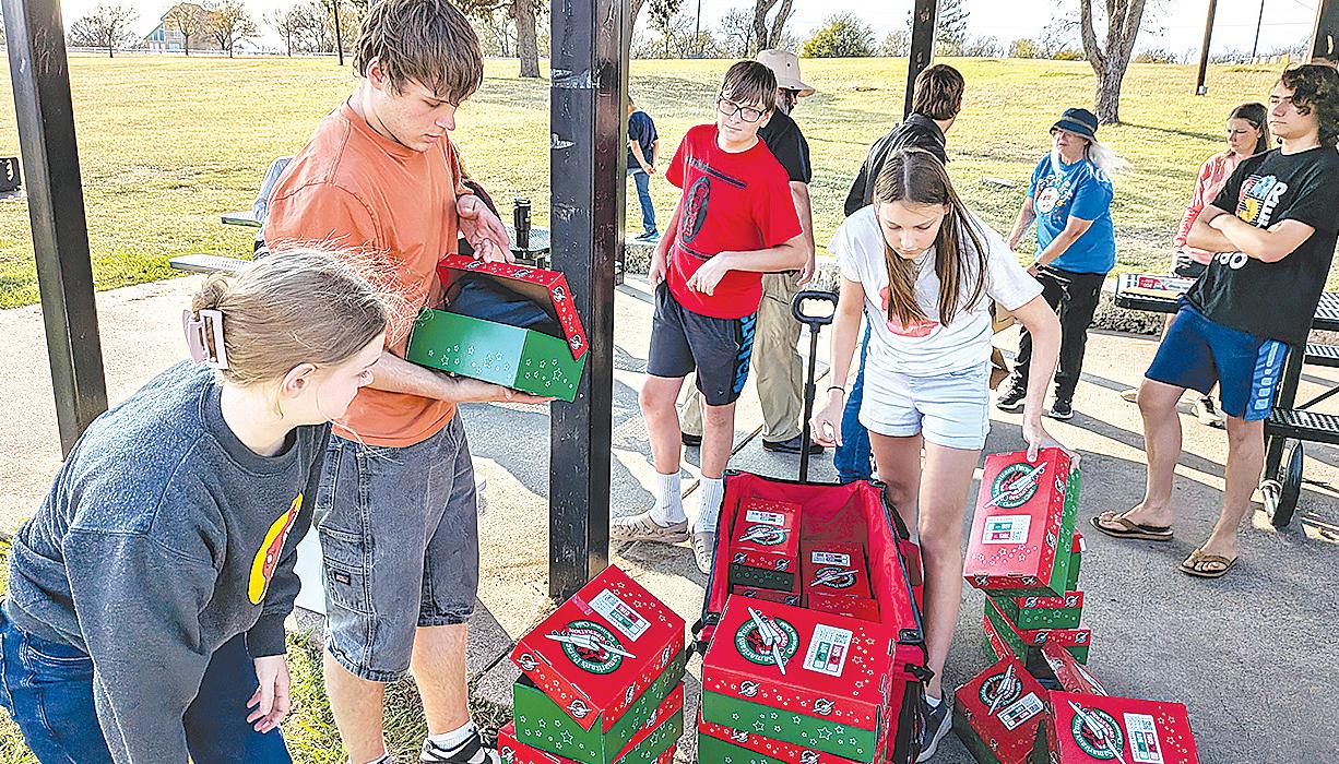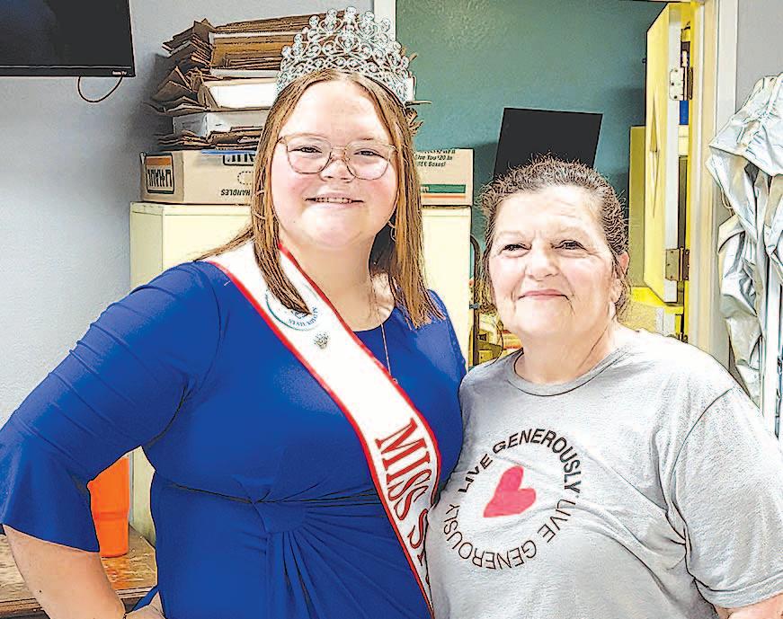 Miss SPJST Paetyn Beckendorf is pictured with canned food donations she helped collect, and Mr. SPJST Levi McAdams fills Operation Christmas Child boxes with his youth leader, Dana McAdams. Their project updates appear on page 26.