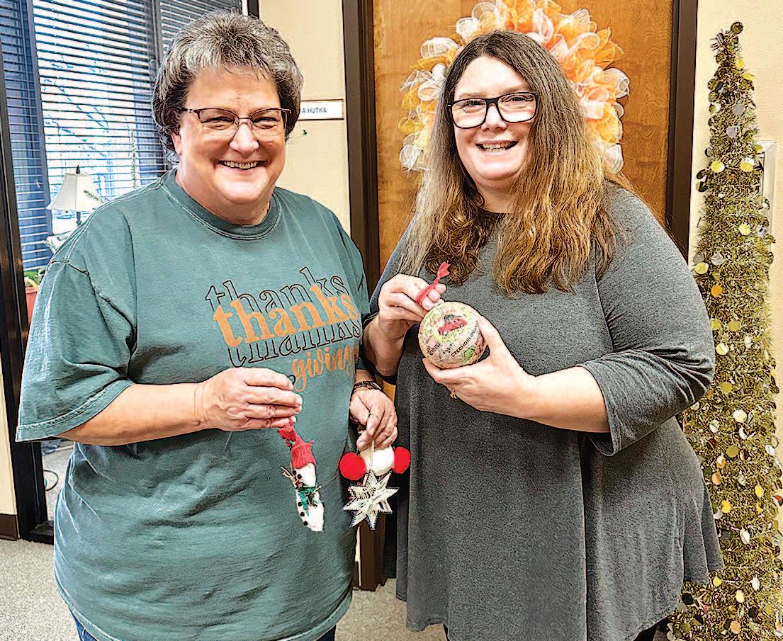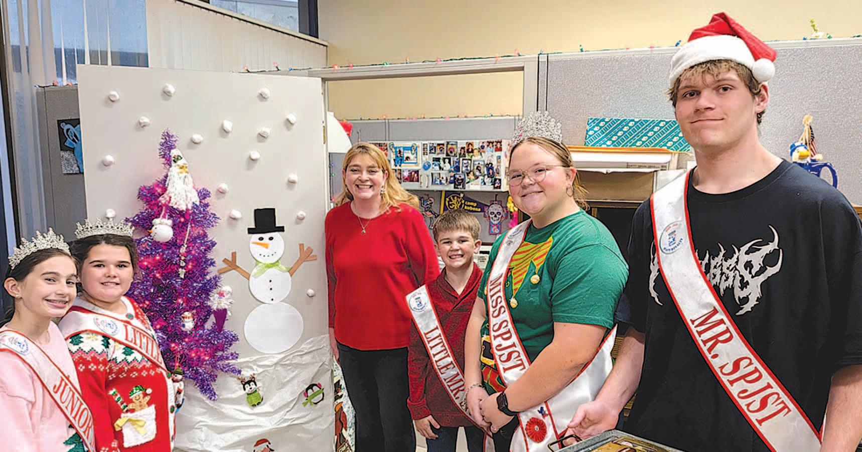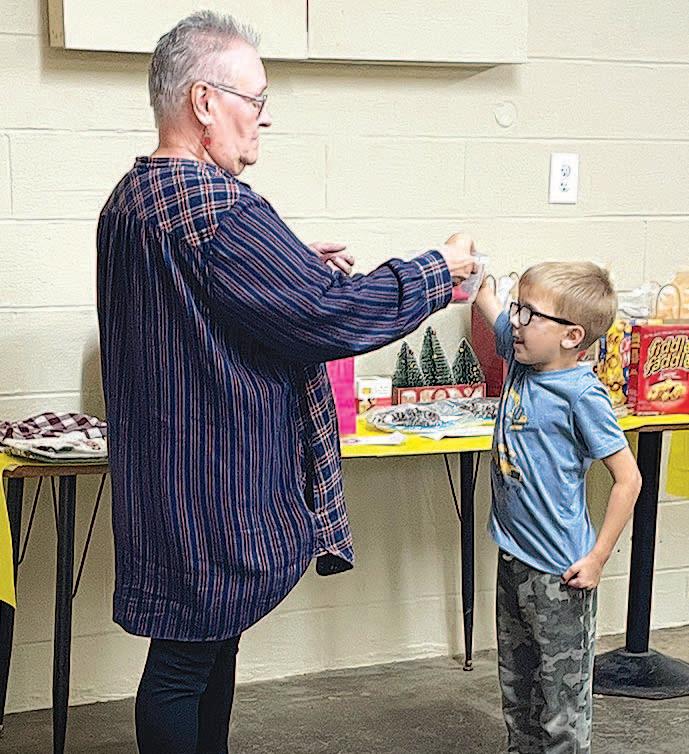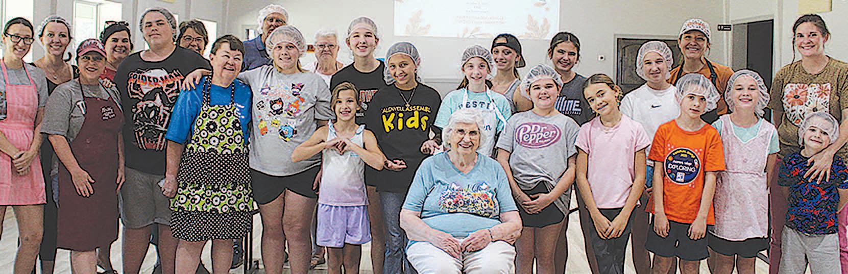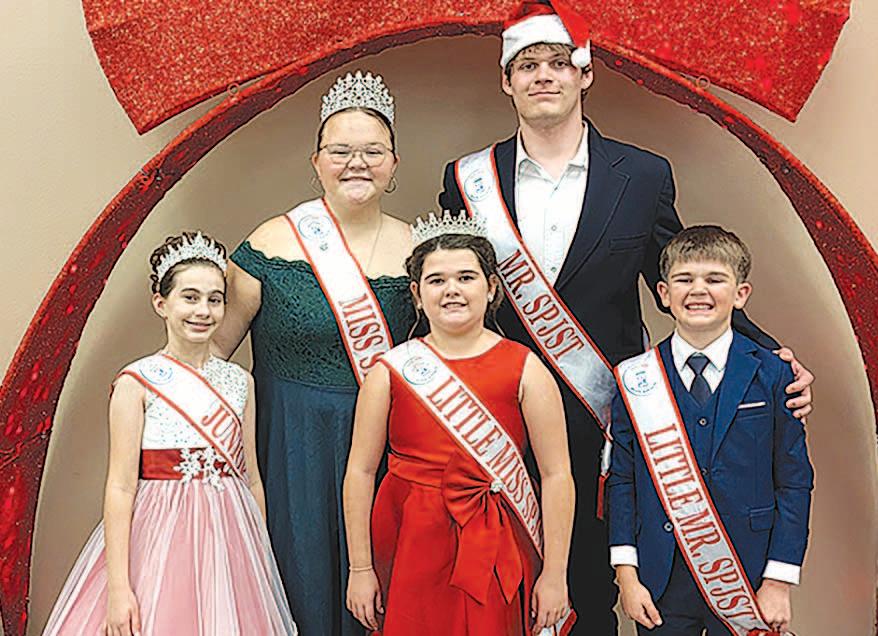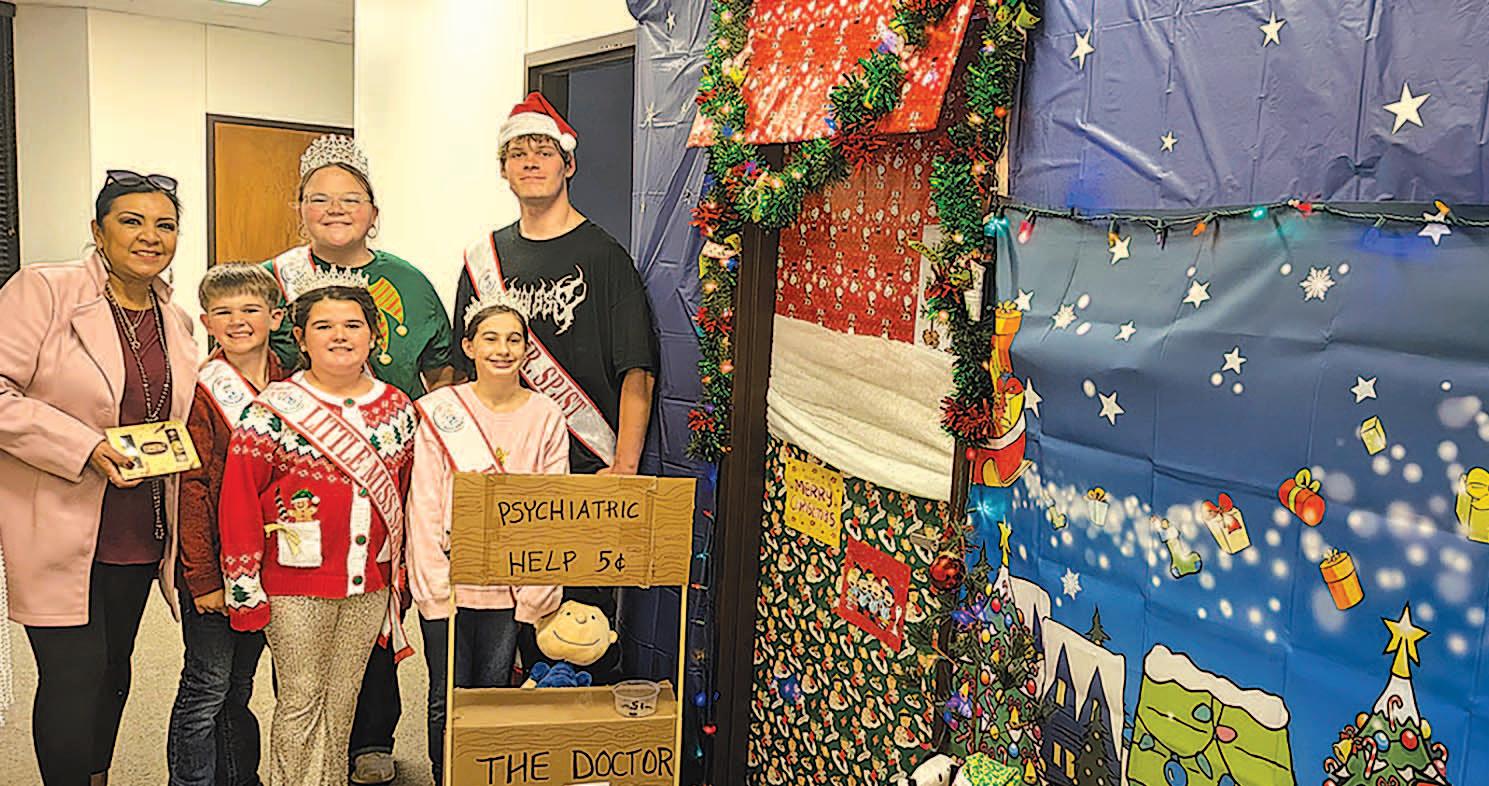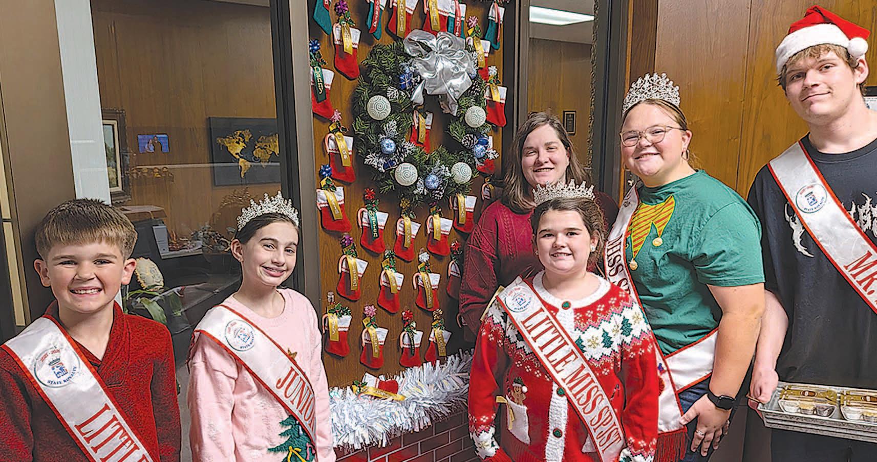 Miss SPJST Paetyn Beckendorf is pictured with canned food donations she helped collect, and Mr. SPJST Levi McAdams fills Operation Christmas Child boxes with his youth leader, Dana McAdams. Their project updates appear on page 26.