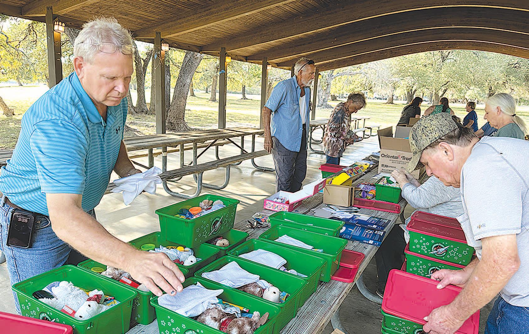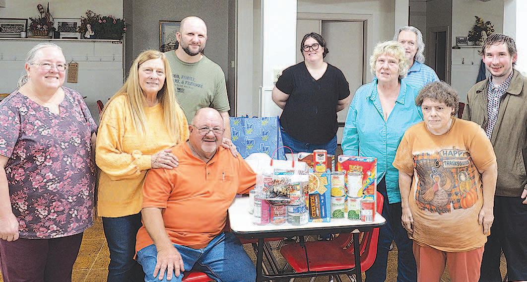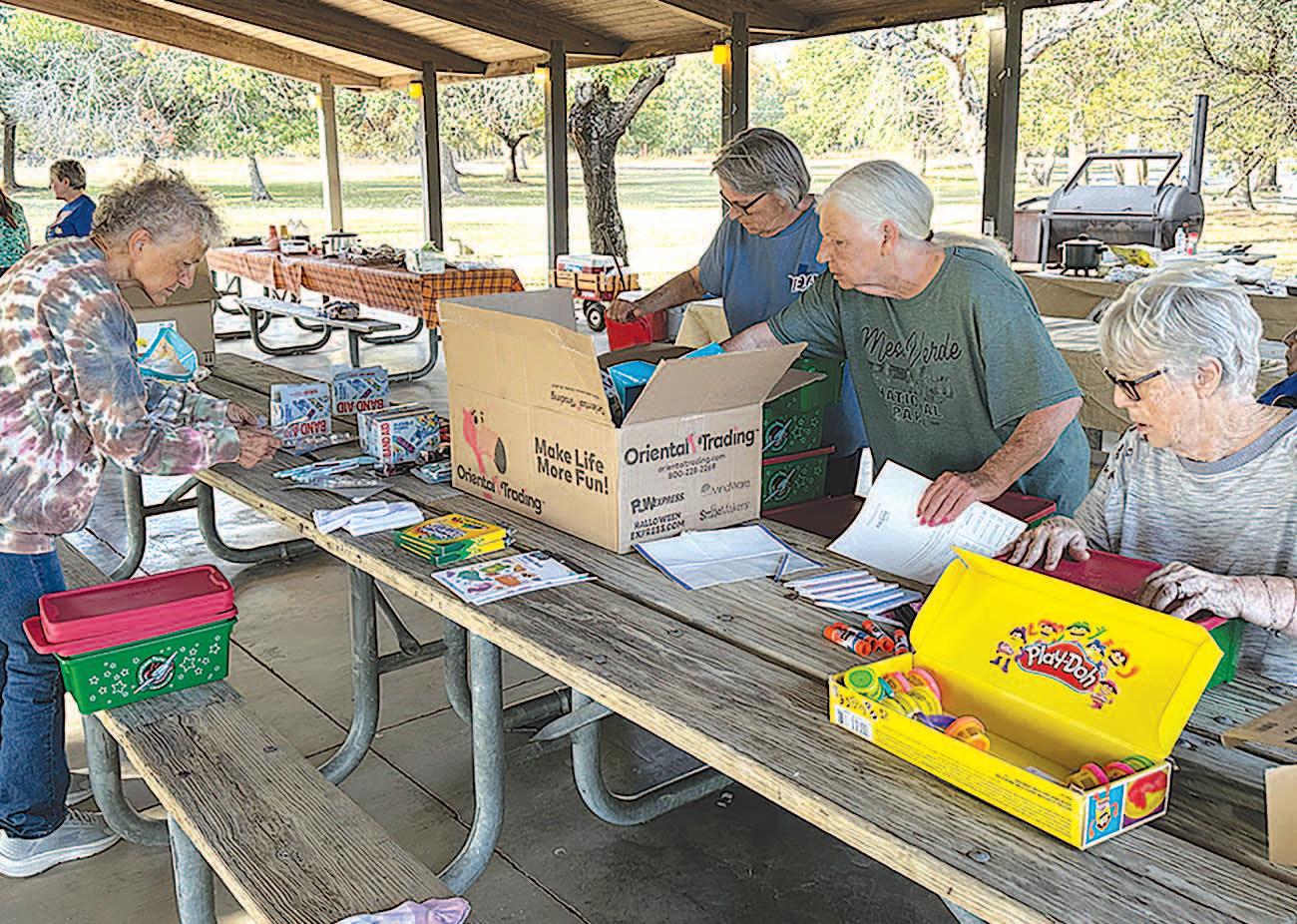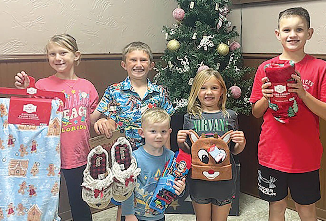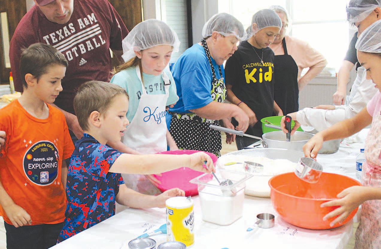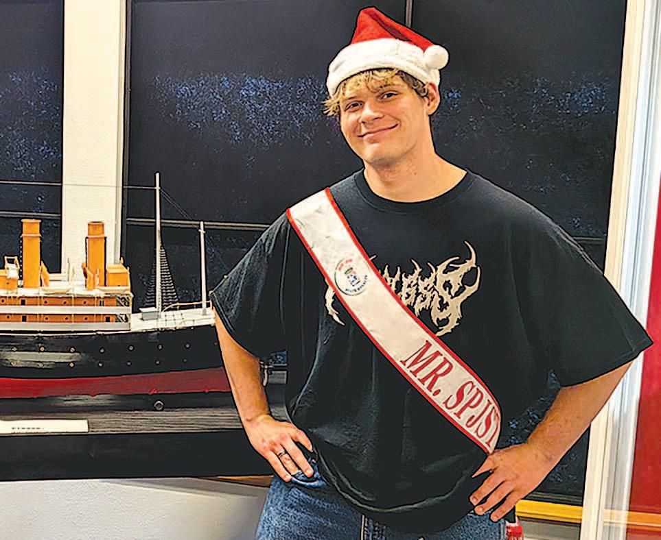 Miss SPJST Paetyn Beckendorf is pictured with canned food donations she helped collect, and Mr. SPJST Levi McAdams fills Operation Christmas Child boxes with his youth leader, Dana McAdams. Their project updates appear on page 26.