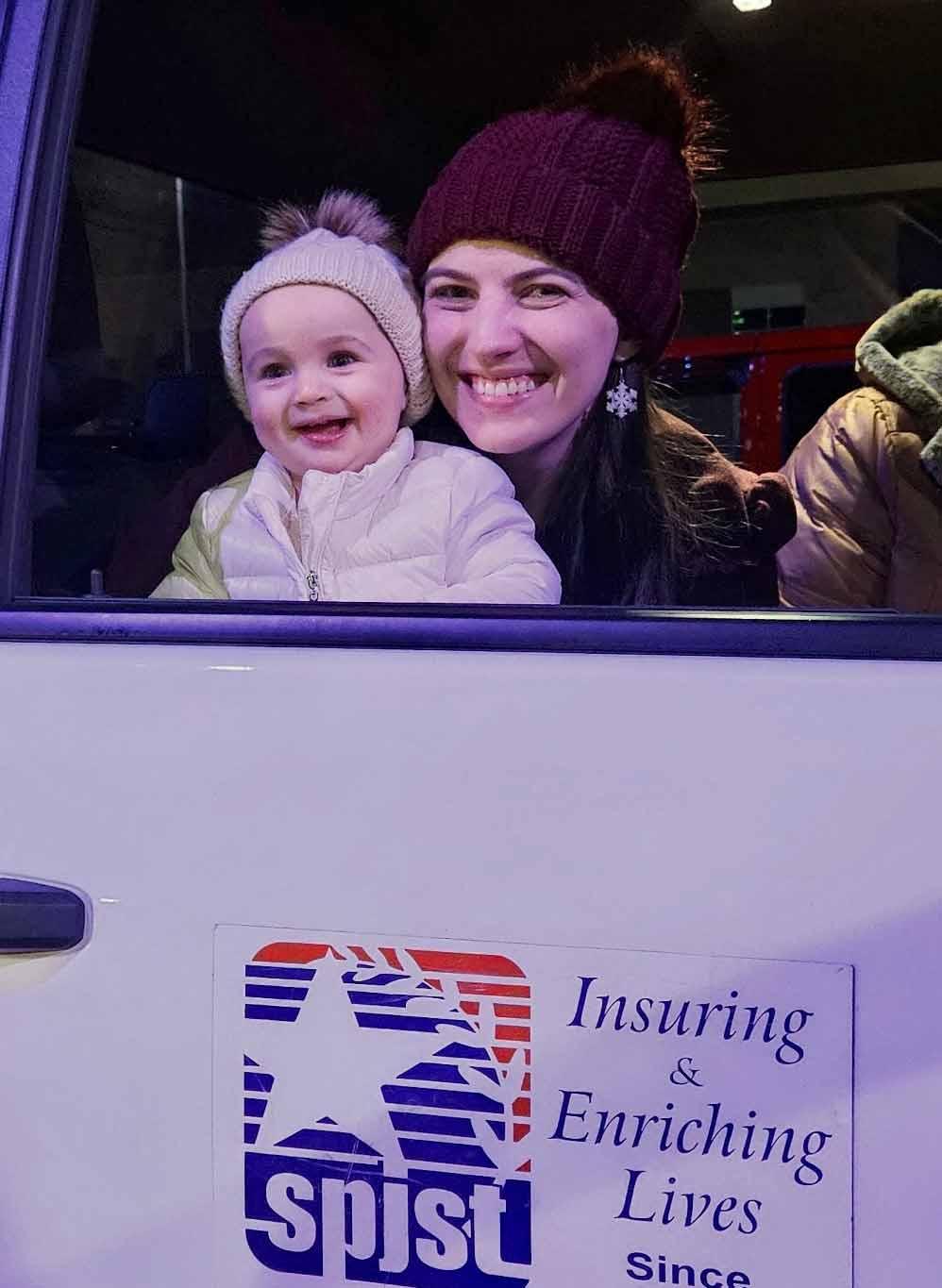 TOP LEFT: SPJST Royalty Court, bundled up and ready to ride the float in the Temple Christmas Parade on December 1. TOP RIGHT: All smiles and waves! Photo by Garrett Simmons, City of Temple Marketing Specialist. BOTTOM LEFT: Representing SPJST on the Lone Star Christmas-themed float. BOTTOM RIGHT: Brooke Hoelscher brings her daughter Lucy to her first parade. Lucy is a new, sixth generation SPJST member.